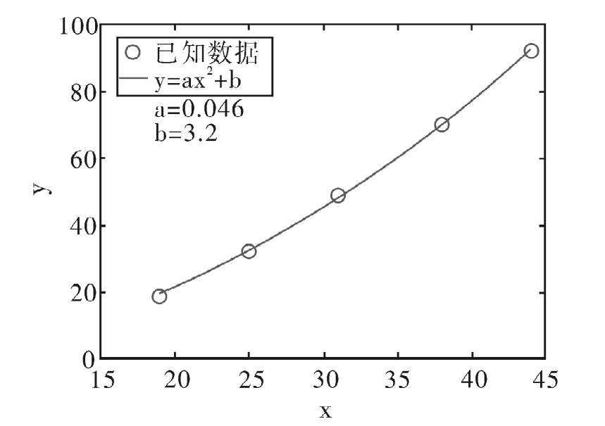 在Matlab命令行窗口运行ex2_10.m程序,得到如下数值结果和结果图 2-3。可以看出:得到的拟合参数 a =0.0462、 b =3.1929,图 2-3 给出了已知数据点和拟合曲线。