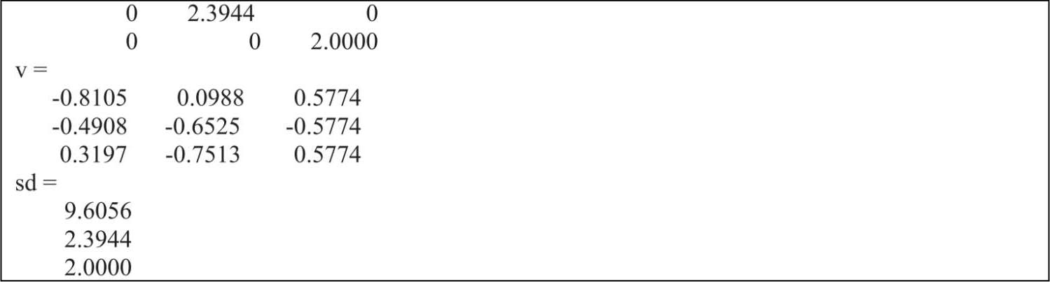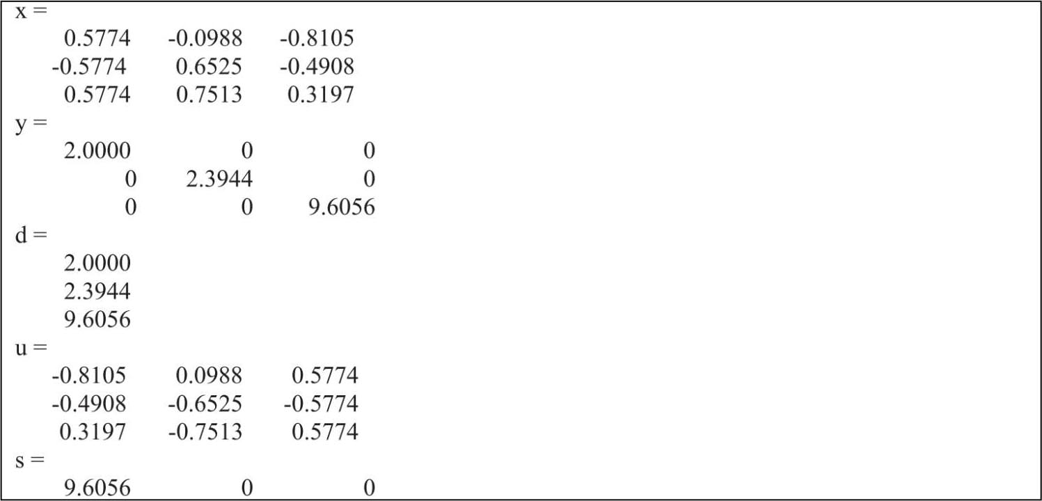 在Matlab命令行窗口运行ex2_12.m中的这些语句,得到如下结果。可以看出:矩阵 A 的特征值条件数 Dc = S V D 分别是矩阵 A 的特征向量和特征值矩阵。从伪逆函数的调用可以看出,线性方程组的系数矩阵 a 的条件数 d 很大时,采用矩阵除法求解会产生伪解,而伪逆函数求得的解为真解,如矩阵 xab 的第三列所示。
