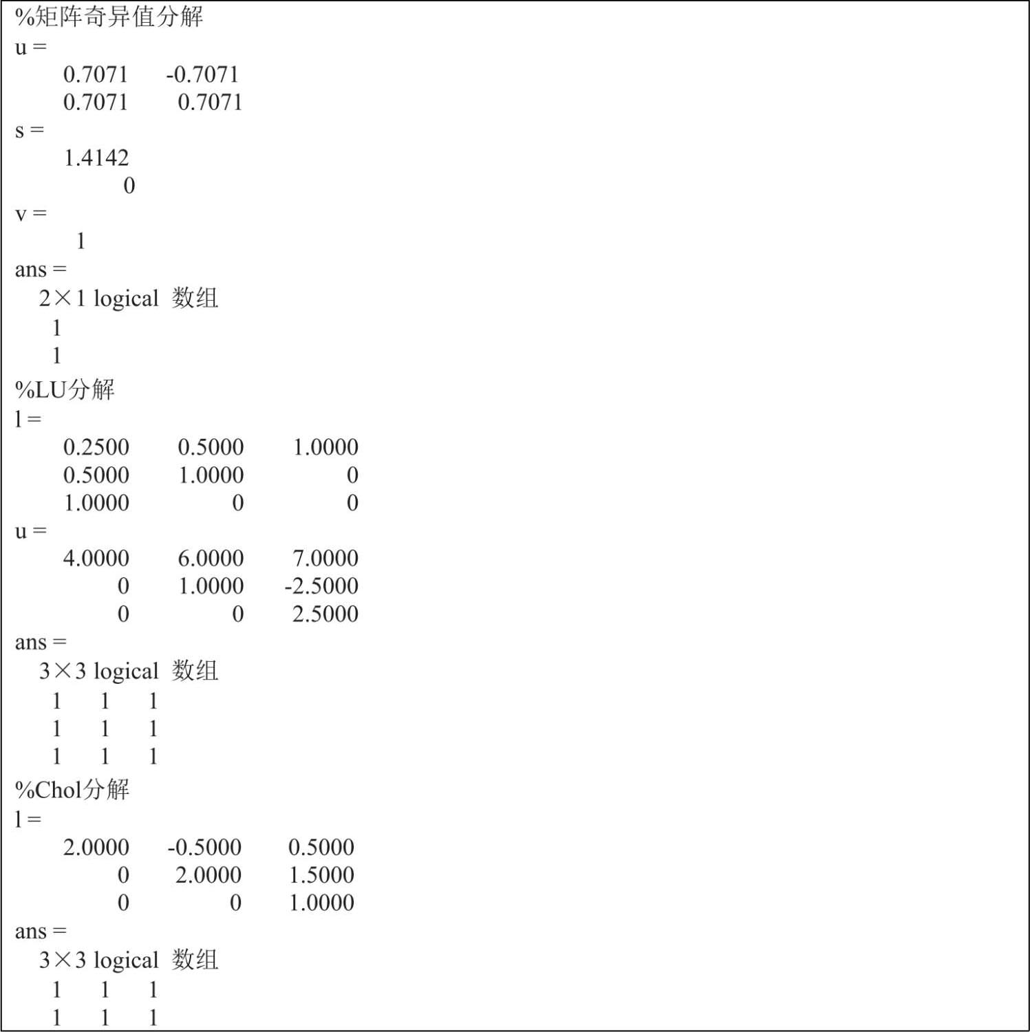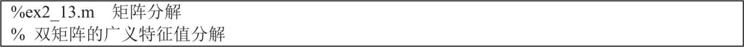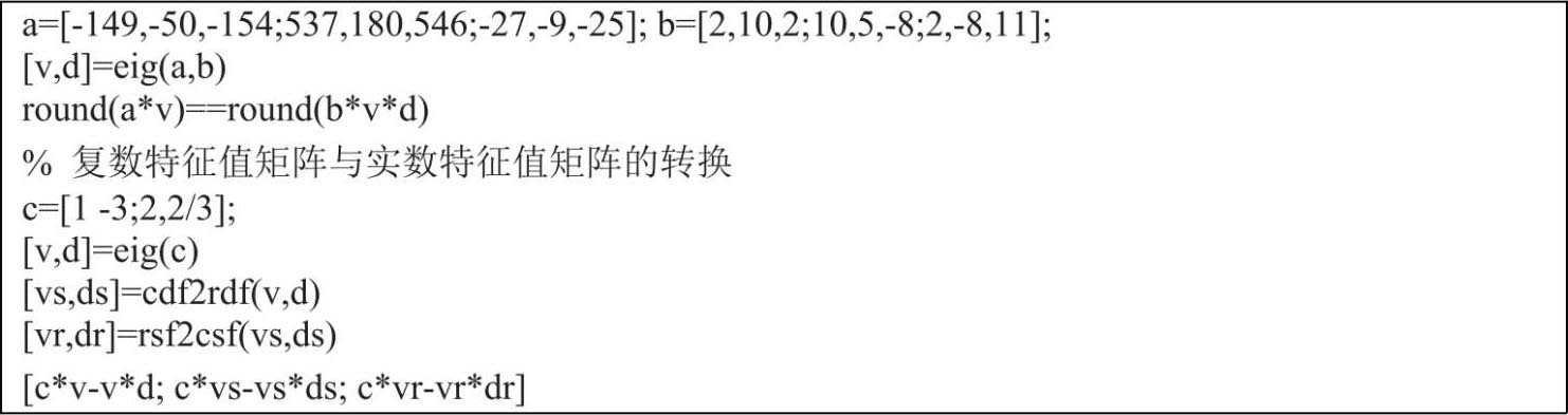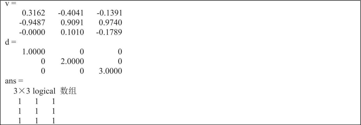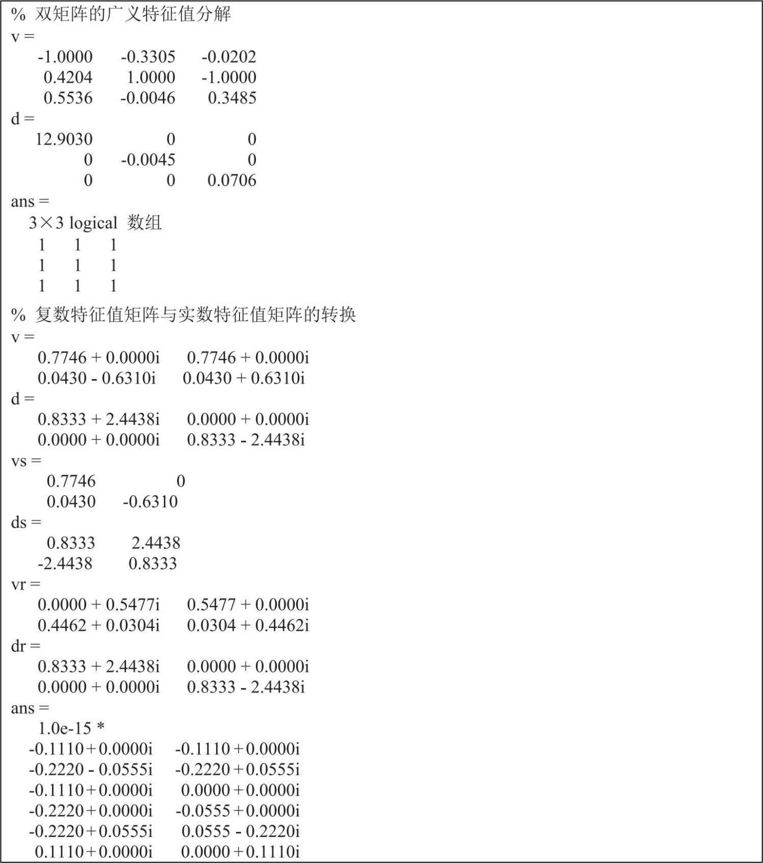 在Matlab命令行窗口运行ex2_13.m中的这些语句,得到如下结果。由 3 ×3 逻辑矩阵ans的各元素均显示为 1 可知,在双矩阵的广义特征值分解中, a × v 与 b × v × d 相等;在复数特征值矩阵与实数特征值矩阵的转换运算中,在Matlab计算误差范围内, c × v - v × d 各元素均为 0,即 c × v 与 v × d 相等,同样地 c × vs 与 vs × ds 相等, c × vr 与 vr × dr 相等。