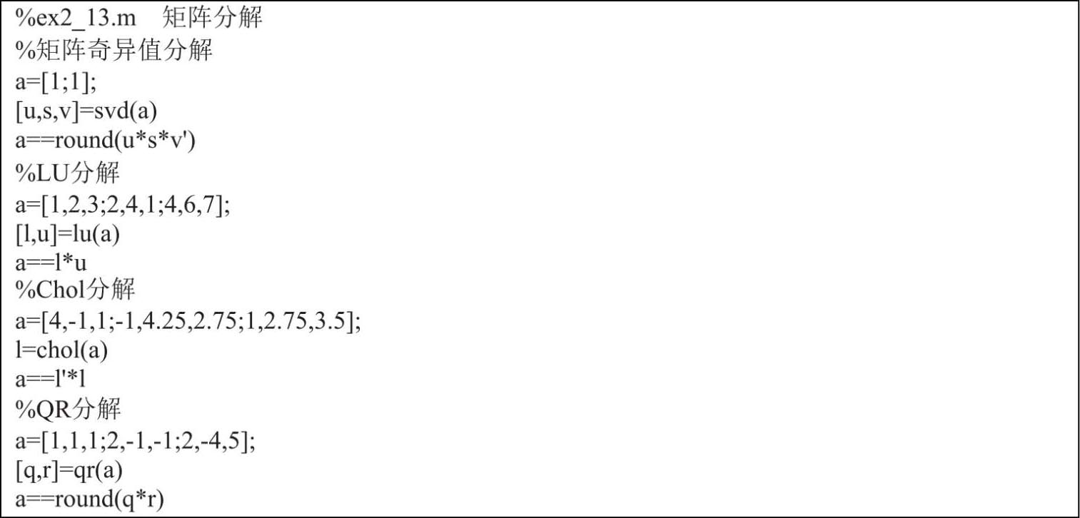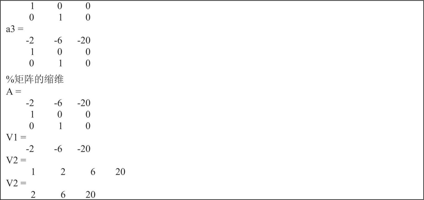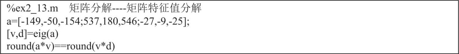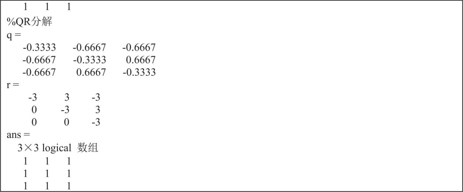 在Matlab命令行窗口运行ex2_13.m中的这些语句,得到如下结果。由 3 ×3 逻辑矩阵ans的各元素均显示为 1 可知,在双矩阵的广义特征值分解中, a × v 与 b × v × d 相等;在复数特征值矩阵与实数特征值矩阵的转换运算中,在Matlab计算误差范围内, c × v - v × d 各元素均为 0,即 c × v 与 v × d 相等,同样地 c × vs 与 vs × ds 相等, c × vr 与 vr × dr 相等。