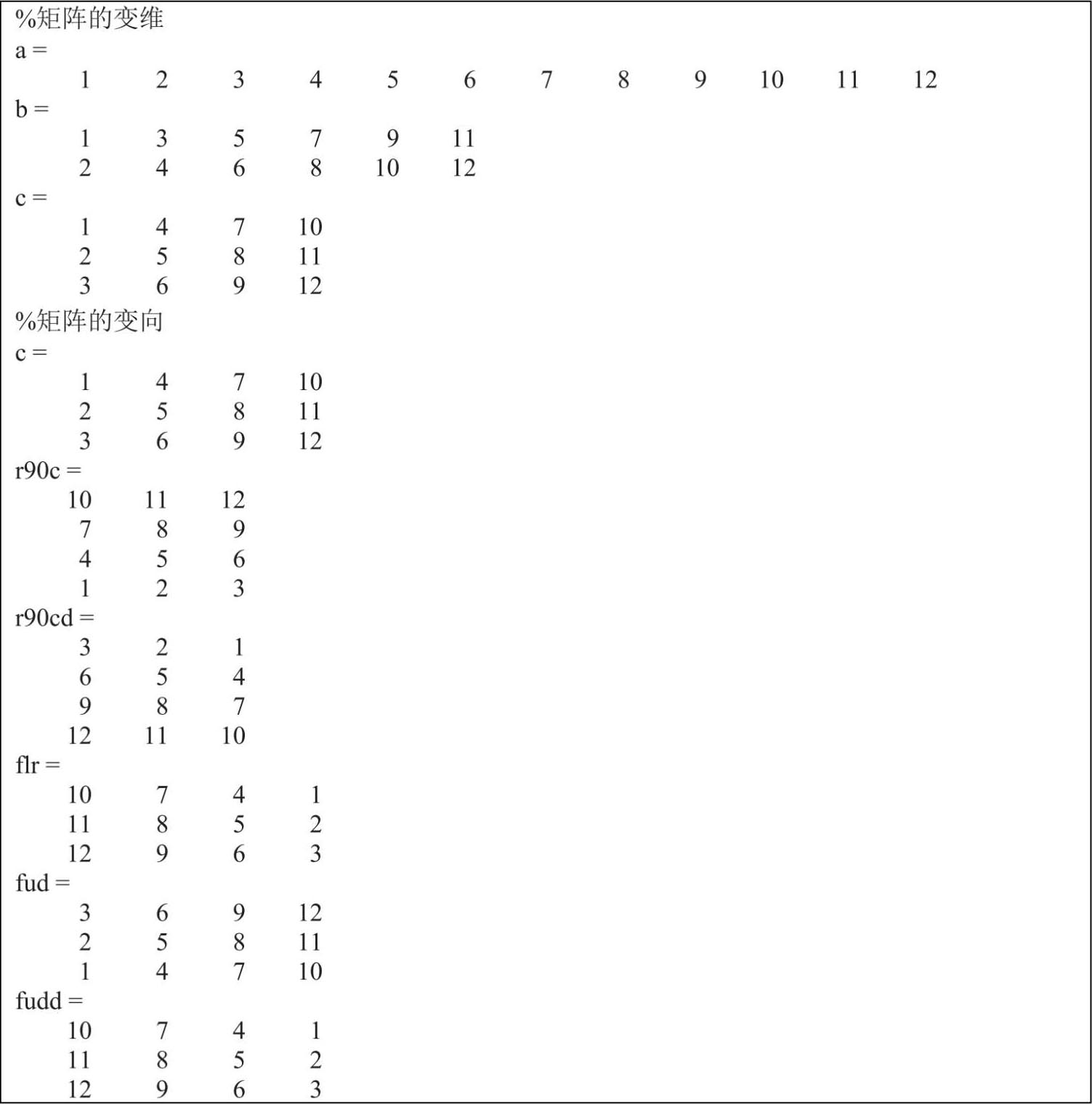 在Matlab命令行窗口运行ex2_14.m中的这些语句,有如下结果。可以看出,矩阵的变维中,矩阵 a 、 b 、 c 具有相同个数的矩阵元素;矩阵的变向中,rot90( c )为 c 矩阵逆时针旋转90 度,不需要输入 k =1;当输入 k =-1 时,矩阵 c 顺时针旋转 90 度。