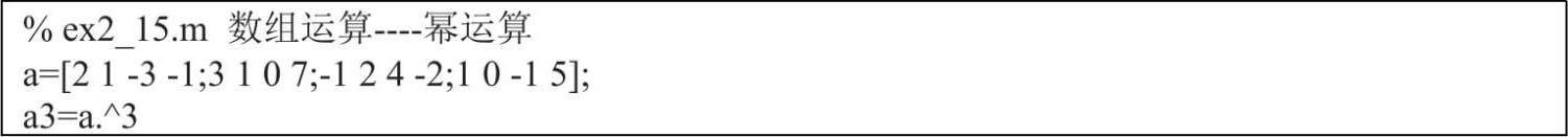 在Matlab命令行窗口运行ex2_15.m中的这些语句,得到如下结果。可以看出,矩阵 a 3各元素是矩阵 a 各元素的三次幂。