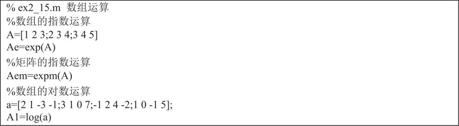 (1)数组的指数运算、对数运算和开方运算分别调用内置函数exp、 log和sqrt实现,而相应的矩阵运算的内置函数为expm、 logm和sqrtm;