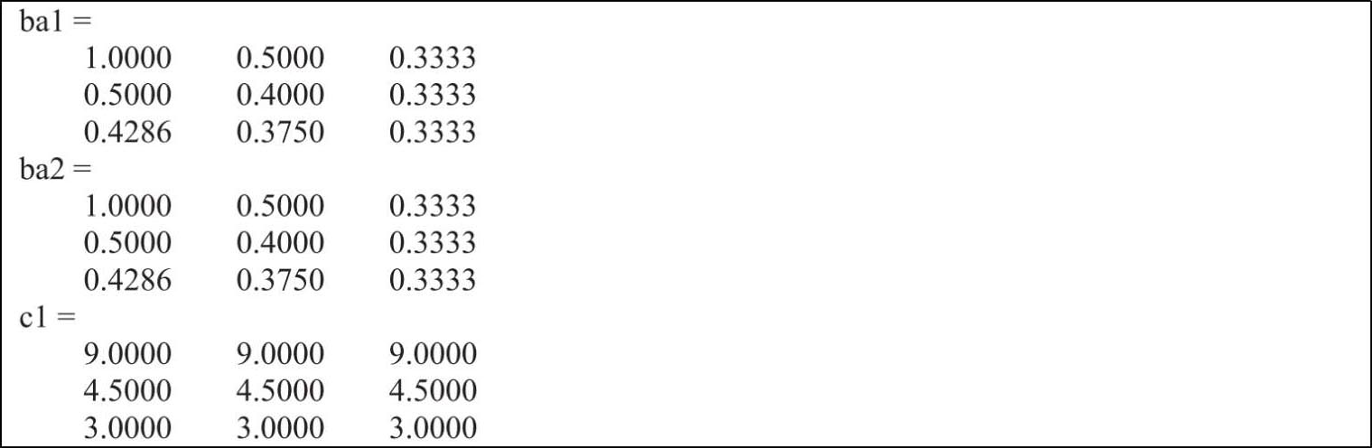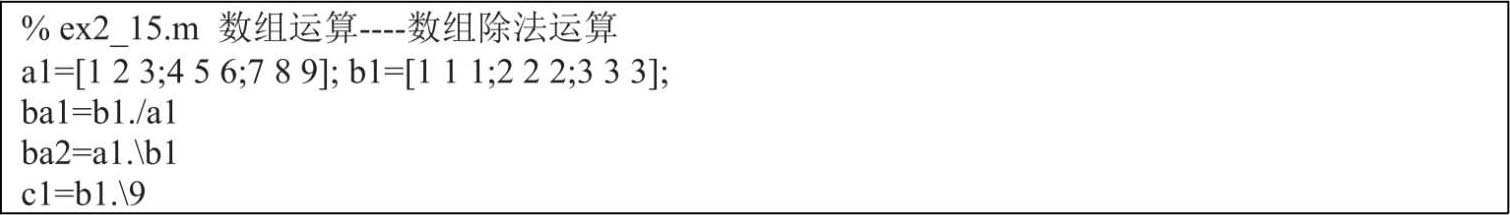 在Matlab命令行窗口运行ex2_15.m中的这些语句,得到如下结果。可以看出,数组的左除 ba 1 和右除 ba 2 结果一样,不需要矩阵转置;在数组除法中常数可以是被除数,见 c 1。