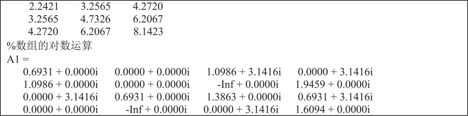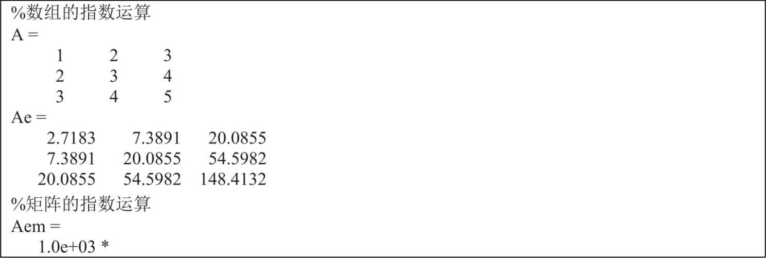 在Matlab命令行窗口运行ex2_15.m中的这些语句,得到如下结果。可以看出,数组 A 的指数运算结果与矩阵 A 的结果存在很大的差异,如 Ae 和 Aem 所示。
