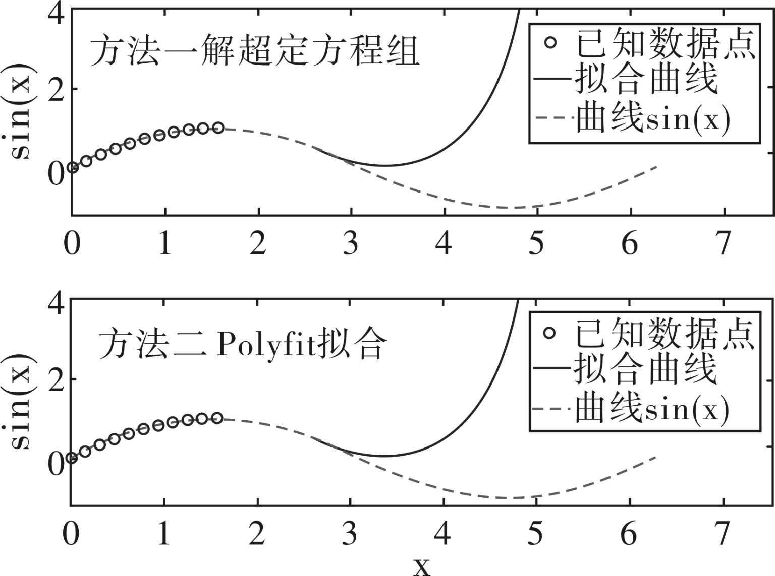 /2]范围内,拟合曲线与正弦函数曲线一致;但已知数据点超出该范围,拟合曲线则偏离了正弦函数曲线,拟合曲线失真。
