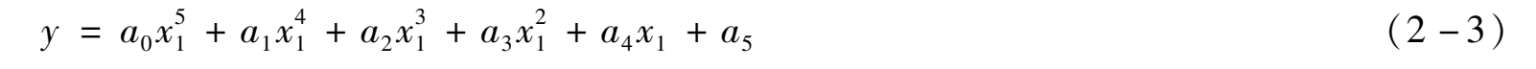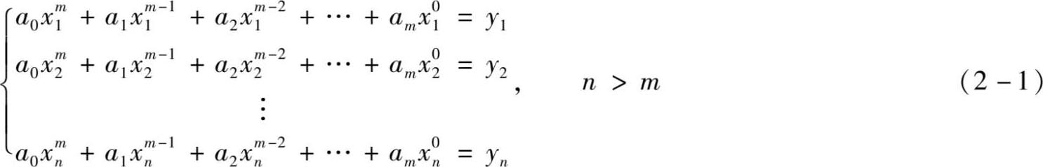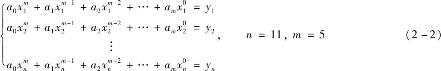 (1)方法一:已知需进行多项式拟合的 n 组数( x i , y i ), i =1,2,…, n ,由矩阵除法求解超定方程组得到 m ( m < n )阶多项式的拟合系数 A =[ a 0 , a 1 ,…, a m ]: