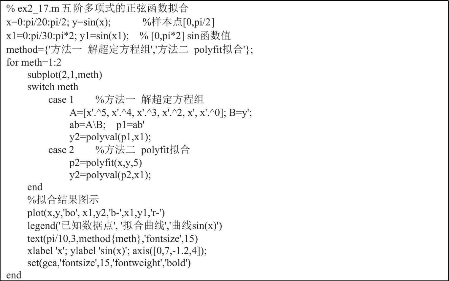 采用矩阵除法解超定方程组、调用函数polyfit实现五阶多项式的正弦函数拟合,编制的Matlab程序见ex2_17.m。运行程序ex2_17.m,得到拟合结果图 2-4。