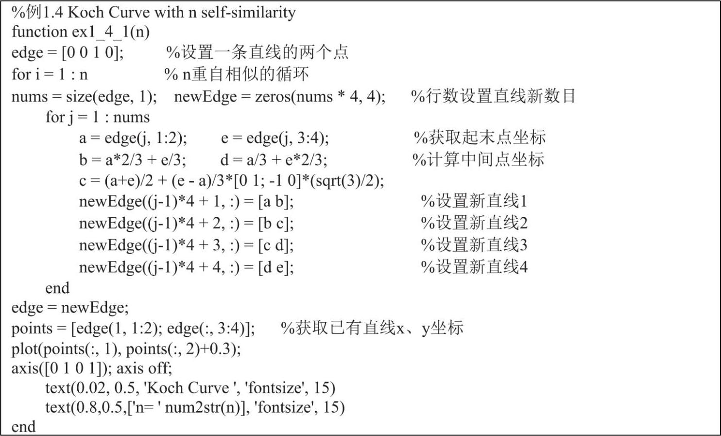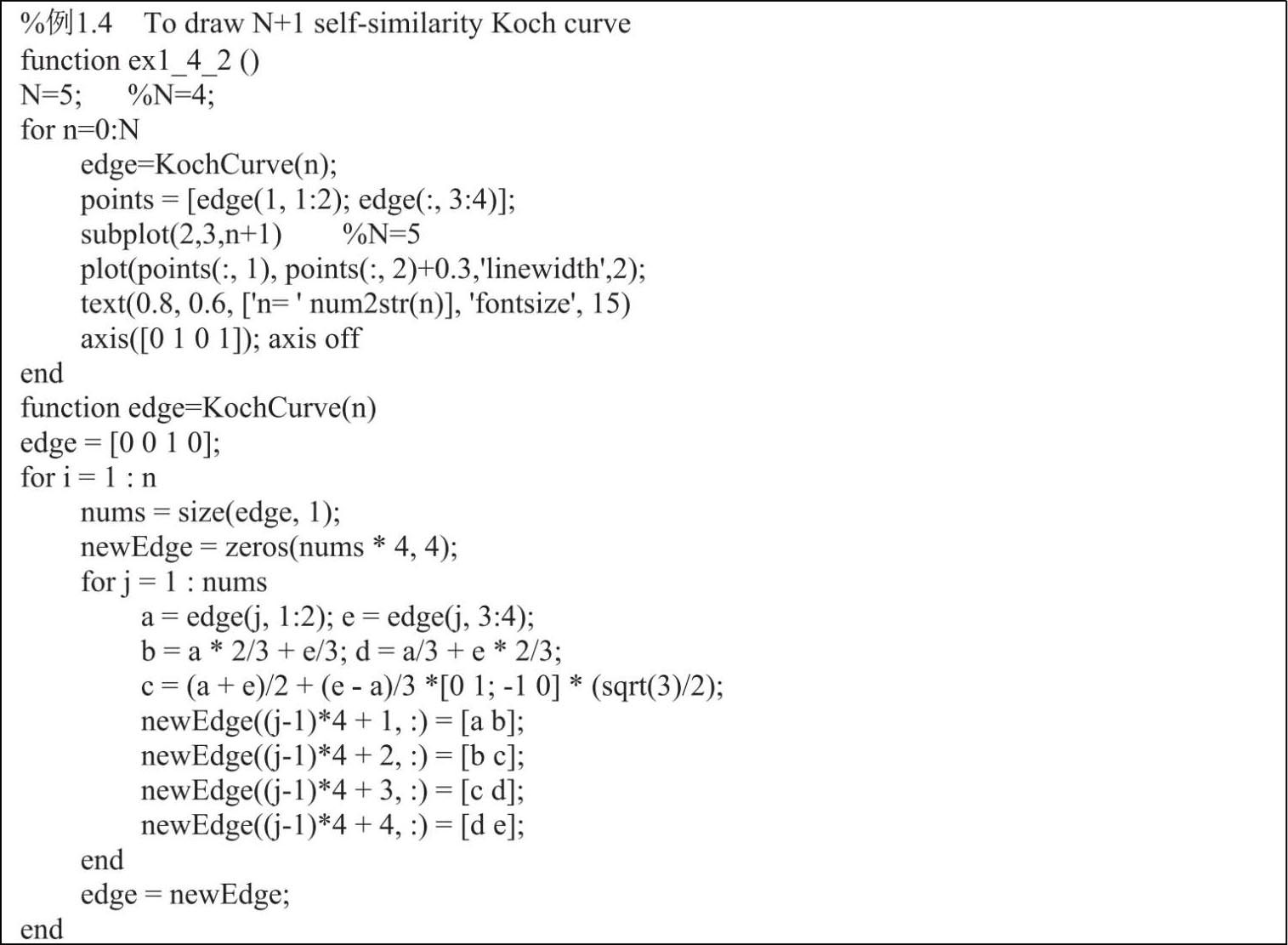 为绘出不同 n 重自相似的Koch曲线图,编制函数文件ex1_4_2.m,其中,主函数ex1_4_2 调用子函数KochCurve,程序如下。