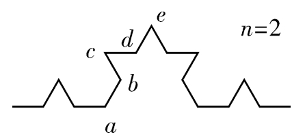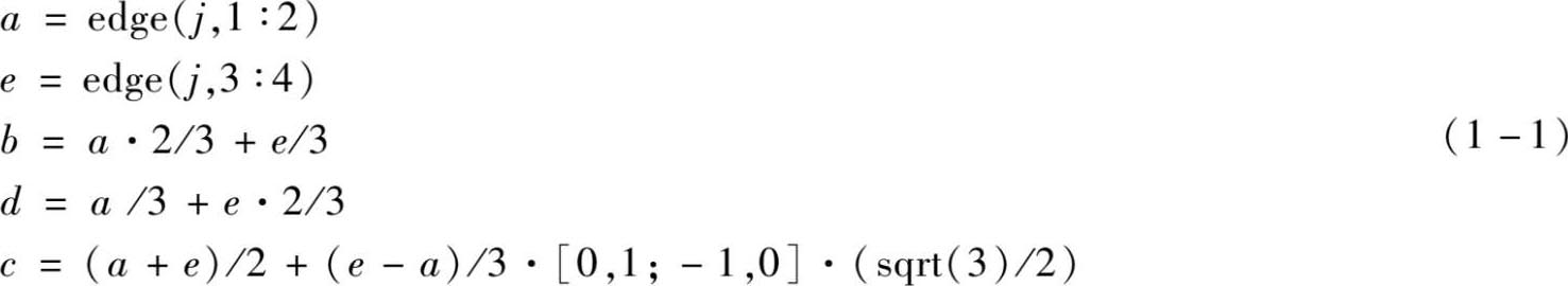 (2) Koch曲线的数学模型。对于图 1-6 中的线段 ae ,由式(1-1)计算出 a 、 b 、 c 、 d 、 e 五个端点坐标, a 是线段 ae 的起端点, e 是末端点, b 和 d 是线段 ae 长度的 1 /3 和 2 /3 点, c 是等边三角形 cbd 的一个顶点。用如上同样的方法进行循环,得到进一层 n =2 时线段 ab 、 bc 、 cd 、 de 的四条线段及 a 、 b 、 c 、 d 、 e 五个端点坐标(见图 1-6)。根据自相似性,进一步地得到 n >2的四条线段的五个端点坐标。