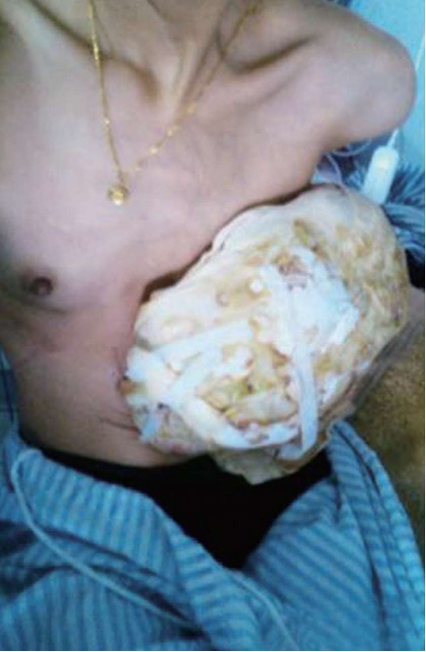病人发现左乳肿物进行性增大半年余。病人自述于2014年4月,无意中发现左乳有一肿物,初始肿物约一荔枝大小,无伴疼痛,未经诊治,未引起重视。随着时间推移,左乳肿物进行性增大,蔓延至整个左侧乳房,约足球大小。肿物表面溃烂呈菜花状,并有脓性、血性液体不断外渗,散发出特殊的恶臭味。为了不让家人及周围的人发现,病人自制了一条2米多长的胸带,紧紧缠绕住自己的胸部,每天都要往身上喷洒特殊的香水来掩盖自身左乳发出的恶臭味,甚至向爱人隐瞒她左侧乳房的病情。由于左乳肿物逐渐增大,病人身体逐渐消瘦,生活工作受到严重影响,于2014年11月6日避开家人,独自一人来到医院乳腺外科找到笔者为其看病。