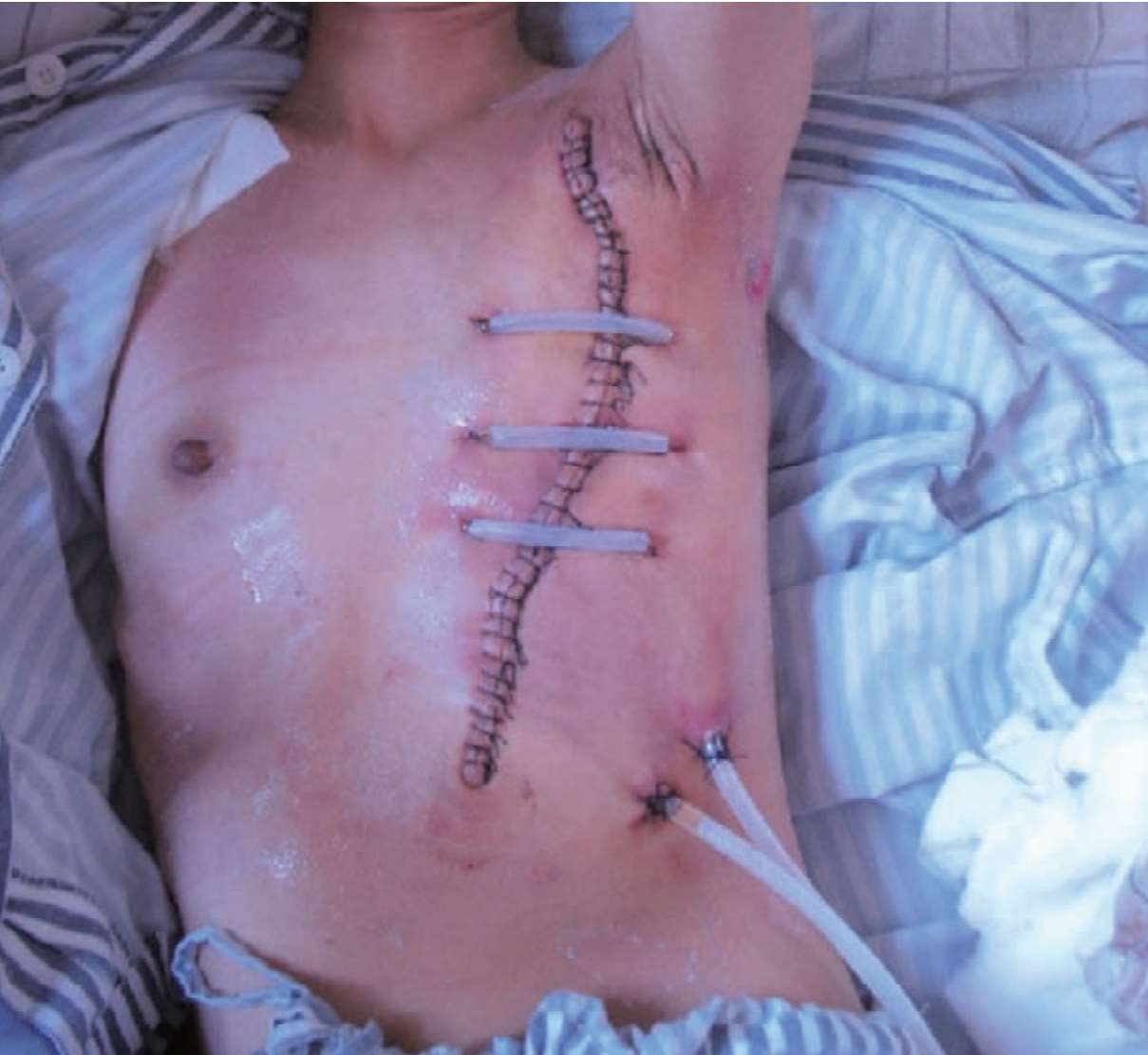 (4)手术修复左前胸壁巨大缺损区的方法:充分游离、松解前胸壁皮肤切口下四周的正常组织,向上游离至左锁骨;向下游离至中上腹壁;向内侧游离至胸骨;向外后游离至右背部,充分利用这些被游离、松解的组织瓣填补、修复左前胸壁的巨大缺损区,同时切开周围的皮肤瓣用钢丝减张缝合,最后,在已修复的左前胸壁巨大缺损区放置引流管,缝合皮肤(缝合后的状况见图3-3)。
