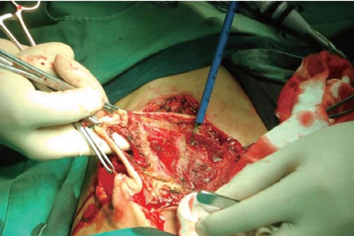 (2)胸壁消毒、铺无菌巾方法与常规方法不同之处在于由于肿瘤巨大,几乎占据了整个左前胸壁,而且肿瘤表面坏死组织合并感染、出血、渗液,若用常规消毒方法不能达到消毒的目的,因此消毒方法是:先采用大量双氧水反复消毒巨大肿瘤及坏死渗血、流脓的部位,然后再用大量碘伏消毒胸腹部、上肢皮肤及肿瘤。将肿瘤表面用无菌、透明塑料膜包盖,将肿瘤及感染部位与正常皮肤完全隔离后再铺无菌隔离巾。