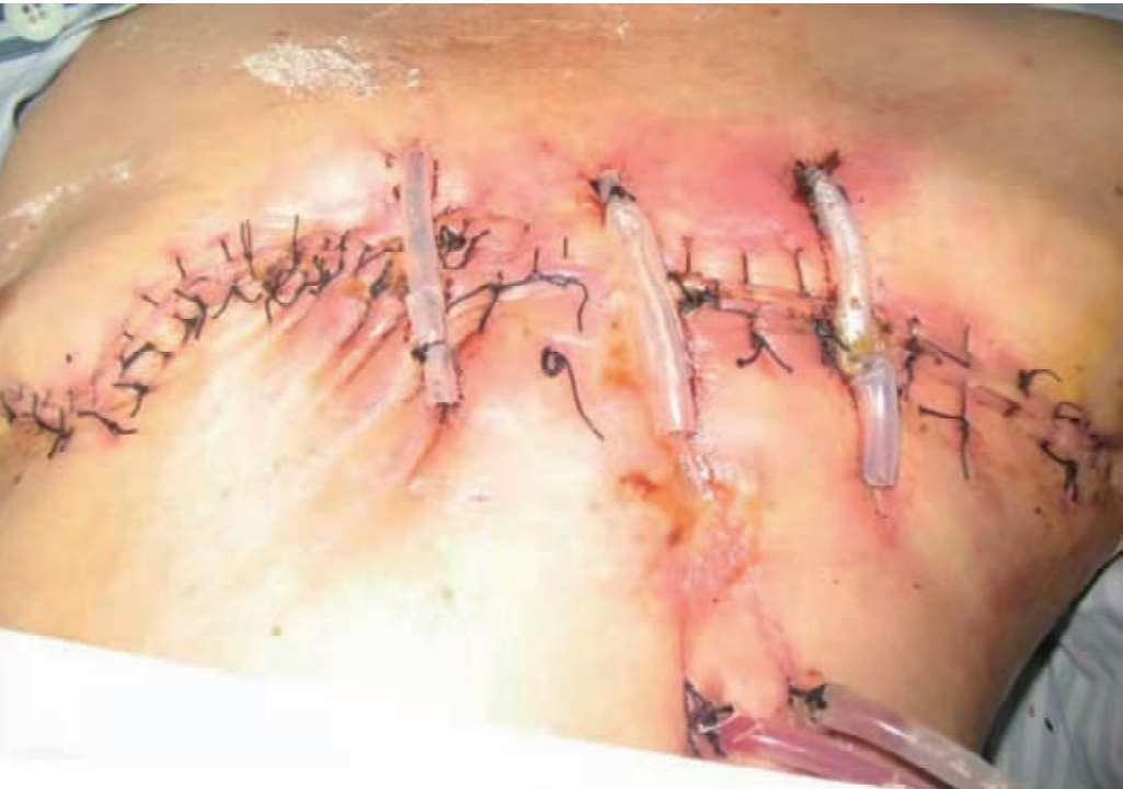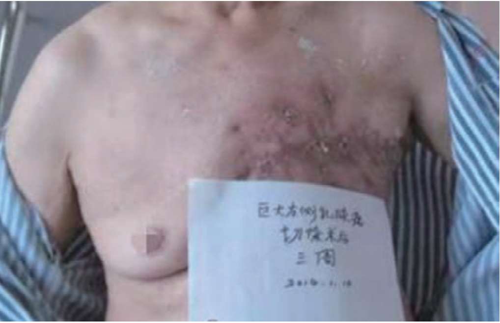 最后术者充分利用病人的自体组织瓣,成功修复了病人左前胸壁巨大的软组织缺损区,成功地解决了这一难题。