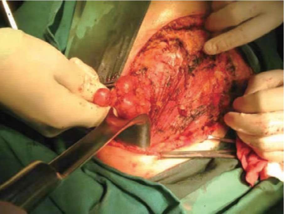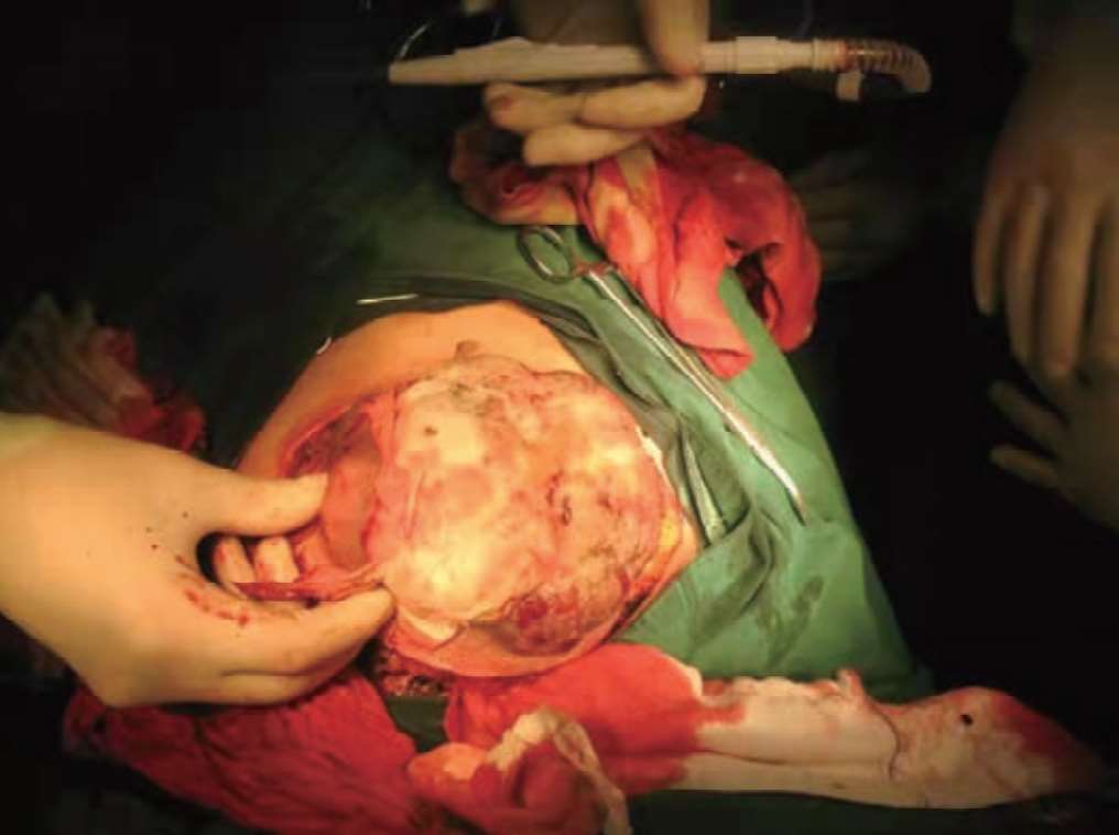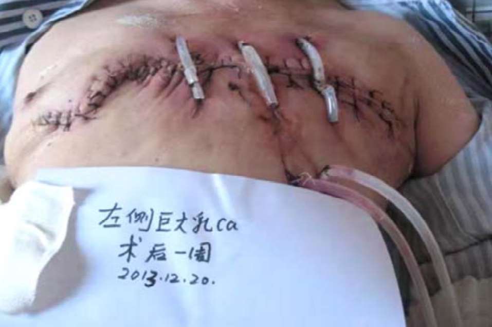 说明:肿瘤即将被整块切除时的实况,在术者和助手的密切配合下,左侧乳房及巨大肿瘤被完整切除,左侧腋窝淋巴结也被清扫。充分游离剩余的正常组织皮下层,包括右侧乳房上腹壁以及左侧胸背部皮下软组织层后,利用这些组织做成带蒂的组织瓣,封闭前胸壁巨大缺损。术中首次使用右侧乳房内侧乳房及带蒂皮瓣修复左侧胸壁软组织的巨大缺损区,用钢丝减张缝合的办法拉拢皮肤与皮下组织切口两边,使切口两边缘的张力减小,最后用七号丝线缝合伤口,使前胸壁的巨大软组织缺损区得到修复。