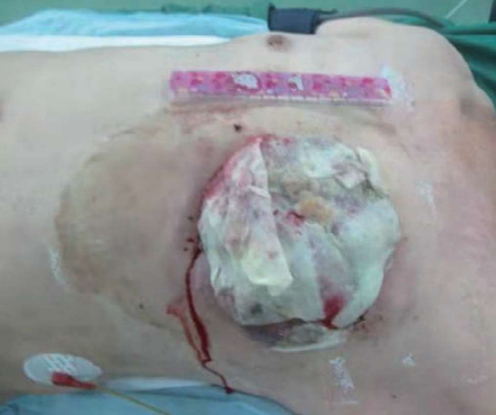 病人发现左侧乳房内肿物10余年,初始肿物约一手指头大小,随着时间的推移,左乳肿物逐渐增大至约足球大小。近一年多来,肿物表面溃烂、坏死、腐烂、发臭(尸臭味),时而有出血,病人情况愈发严重。因年龄较大,为乳腺癌晚期,合并有糖尿病、高血压、心脏病等多种疾病,病人四处求医无门。