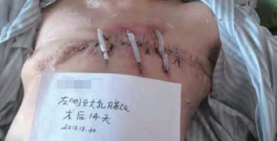 家属表示:因为病人左乳巨大肿瘤的表面坏死腐烂、异味较重、出血,病人家属担心会被“传染”,于是将病人单独隔离,由家属每日戴着厚厚的口罩前往送饭送水、料理生活,但同时家属也并未放弃一丝希望,始终到处打听,求医问药。