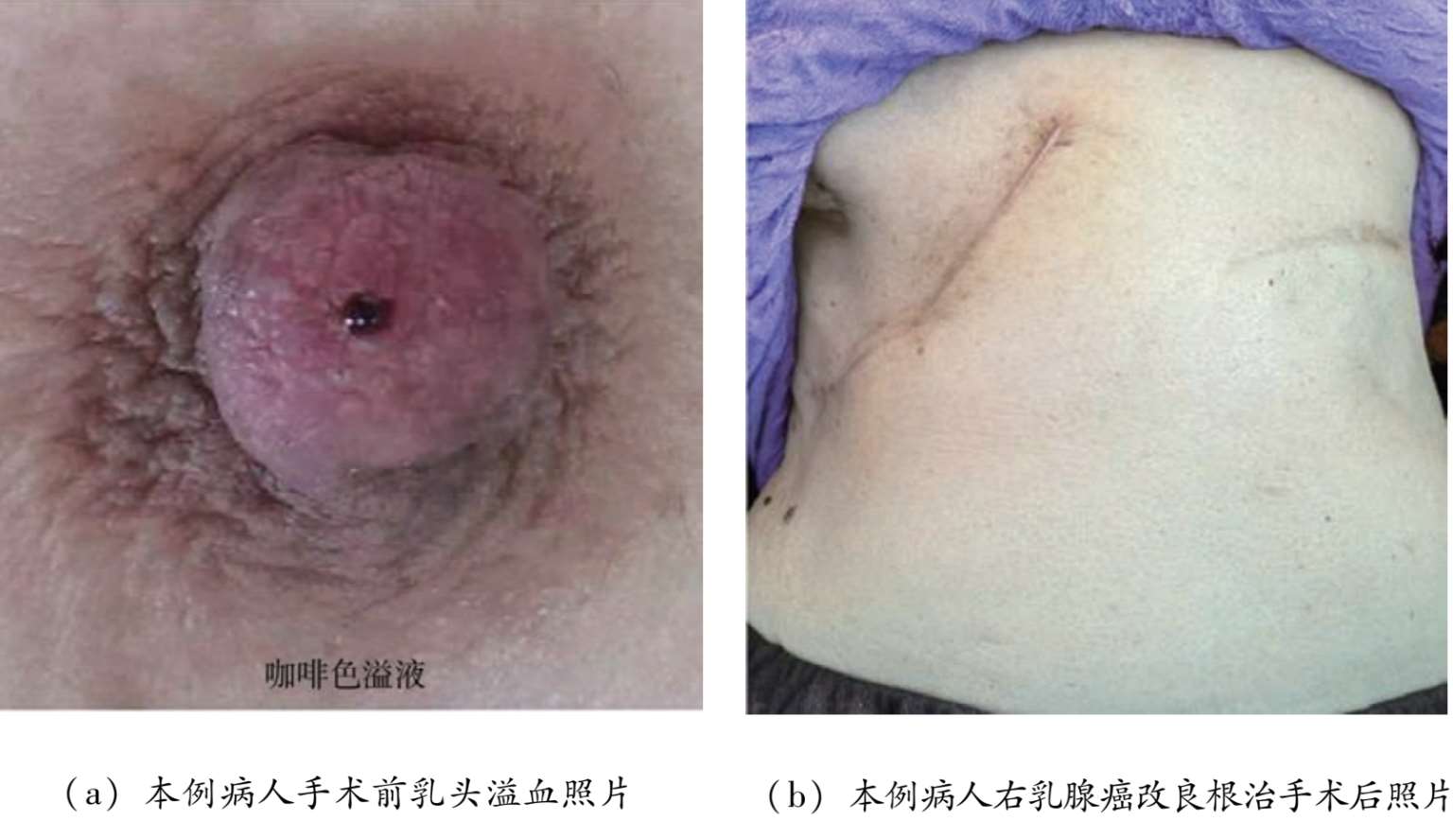 因患左侧乳腺癌,病人10年前曾行乳腺癌根治术,术后一般情况良好;因右侧乳头血性溢液一月余,于2021年3月3日收住乳腺外科治疗。