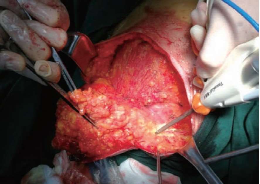 手术操作中的实况照片显示(见图2-21):术野清晰,创面清爽、干净,出血量很少。术中术者熟练使用超声刀操作,使复杂的手术操作简单化。