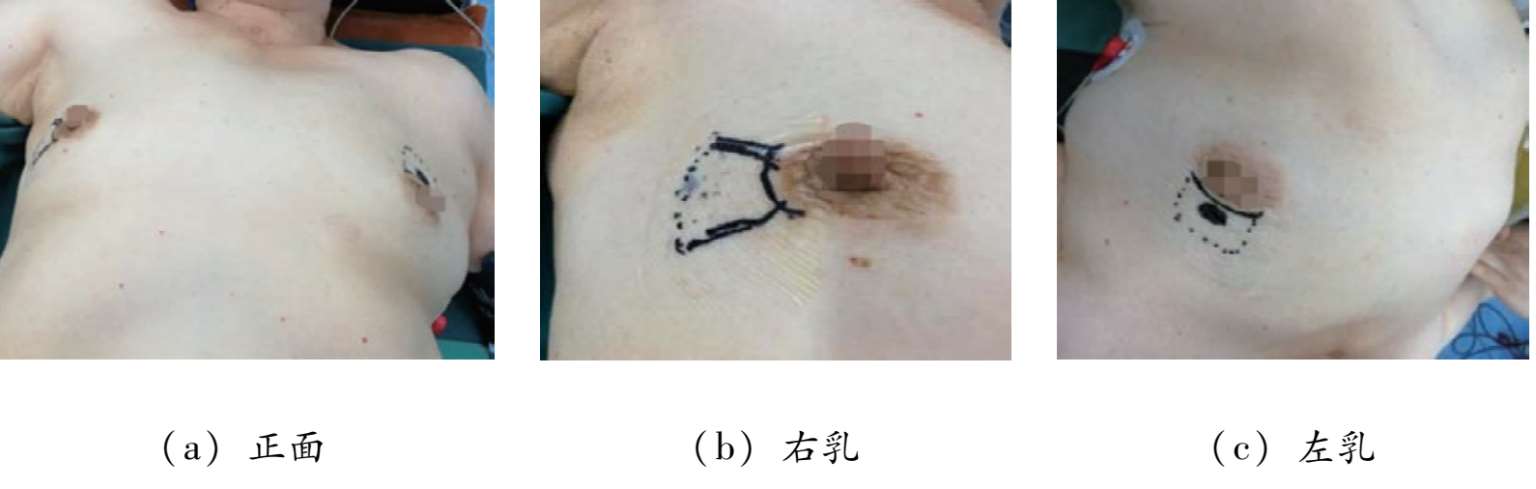 病人第一次手术前双乳照片及手术切口与病变部位标记如图2-18所示。