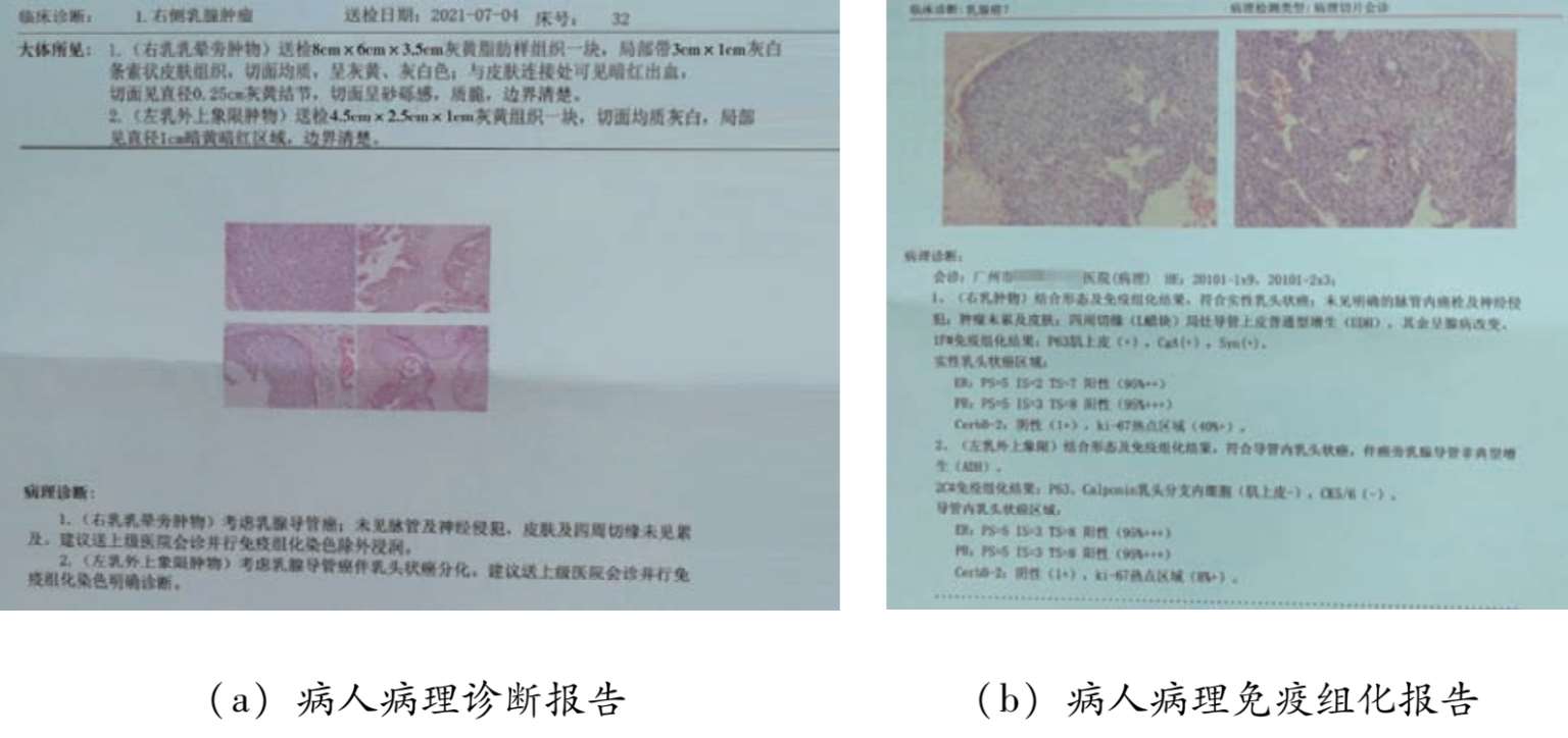 主管医生将病人的病情及讨论意见详细告知病人及其家属。病人及其家属均拒绝做乳腺穿刺活检,要求直接手术并签署了手术同意书。2021年7月5日,病人在气管插管全麻下行双侧乳腺区段切除术,术程顺利,术后病理诊断及免疫组化结果显示为右乳腺乳头状癌、左乳导管内乳头状癌,伴有癌旁导管非典型增生。免疫组化结果为PR:+++,ER:+++,CerbB-2:阴性(++)。