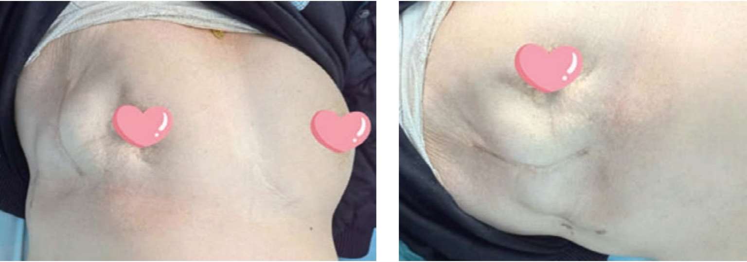 因为病人体形较肥胖,双乳较丰满,手术切除了右乳外上象限、外下象限,使右侧乳房缺少了大半,如果直接缝合伤口,必然会造成右侧乳房大部分缺损,严重影响乳房形态美观,在病人的心里留下阴影,违背了术前病人保乳求美的愿望。
