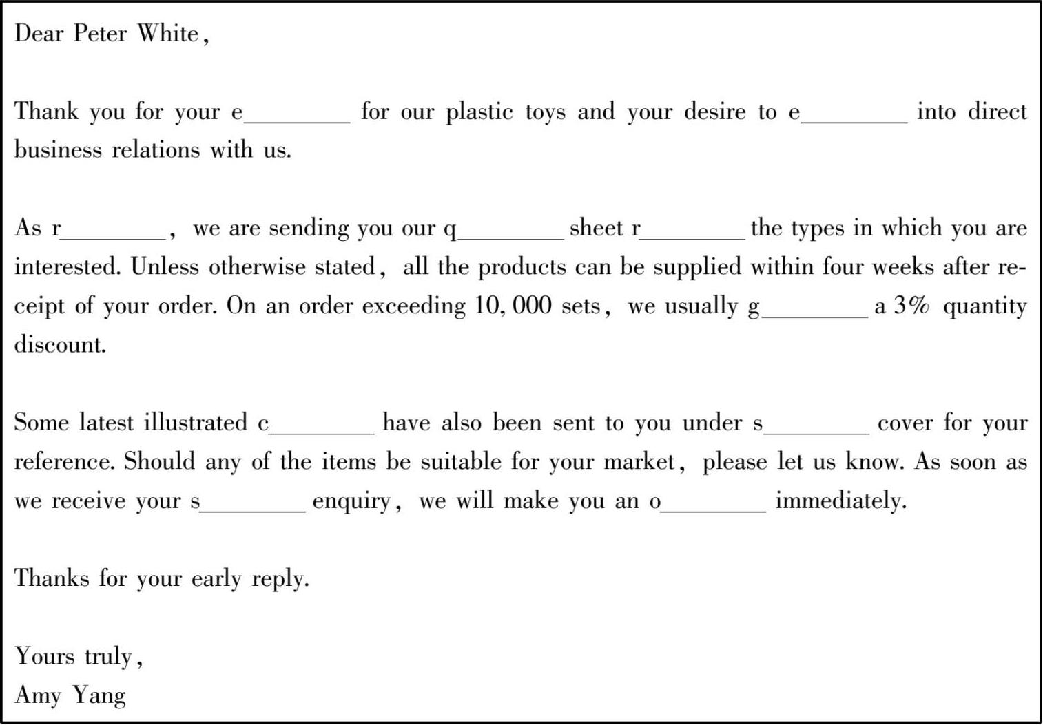 A.目前,我们对各种葡萄酒非常感兴趣,如你方能航空邮寄最新的样品给我方,我们将非常高兴。