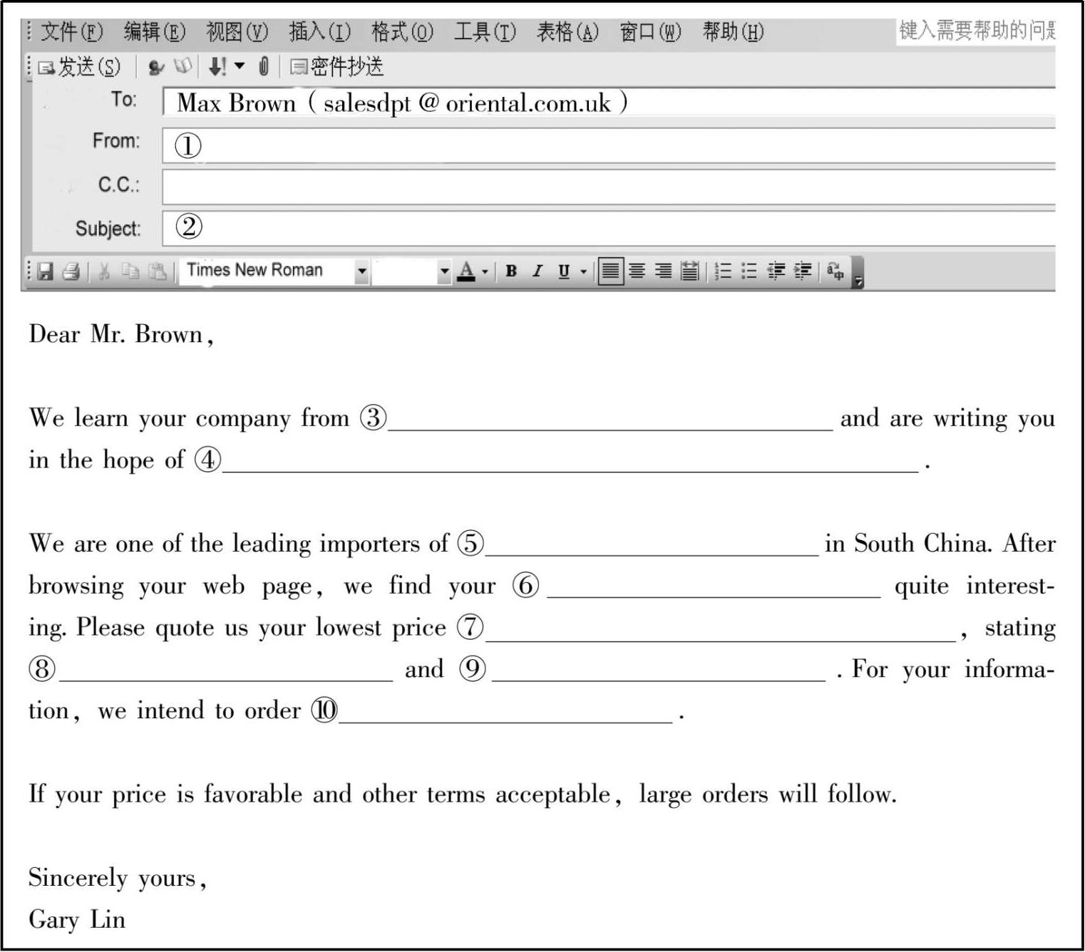 广州立昂贸易公司(lyonimp@public.gz.cn)是一家皮具进口商,最近该公司的业务员Gary Lin在互联网上浏览了英国Oriental贸易公司的网页,对他们经营货号为123的皮具感兴趣,于是发电子邮件给Max Brown(salesdpt@oriental.com.uk),要求对方报200件CIF广州最低价,并指明支付条款和折扣。请根据上述情景完成下列邮件的信息。