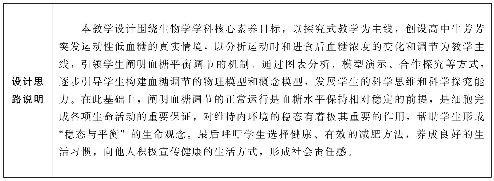 本教学设计围绕生物学学科核心素养目标,以探究式教学为主线,创设高中生芳芳空腹运动而引发运动性低血糖的真实情境,贴近生活,易引起学生的学习兴趣,导课新颖。课堂教学通过图表分析、自制模型演示、合作探究等方式,逐步引导学生构建血糖调节的物理模型和概念模型,发展学生的科学思维和科学探究能力。板书设计图文并茂,简洁明了,重点突出。新课讲授形象生动,采用总结归纳、知识内化的方法进行合理的结课,呼吁学生选择健康、有效的减肥方法,养成良好的生活习惯,向他人积极宣传健康的生活方式,培养社会责任感,较好地实现了社会责任目标。