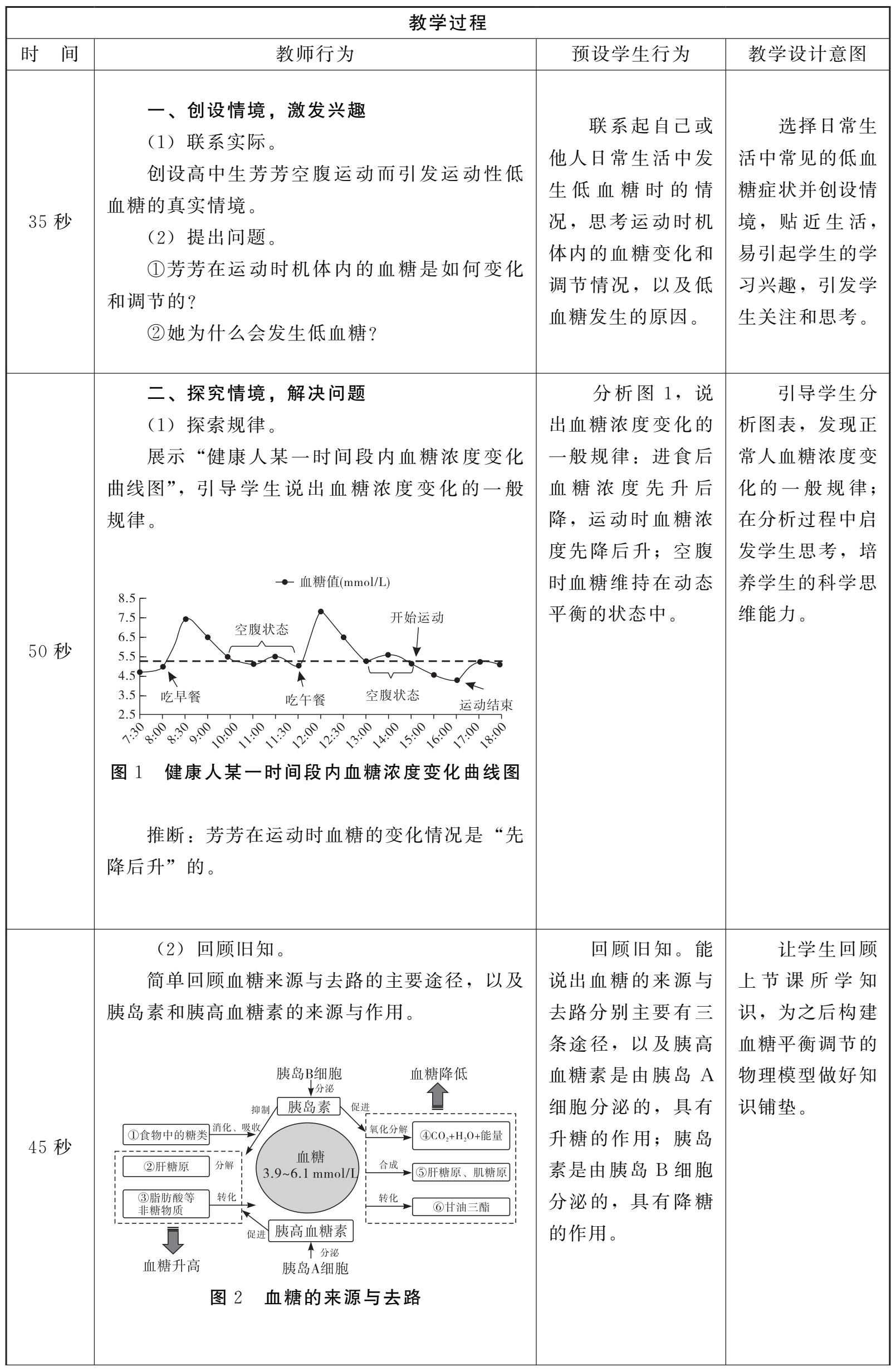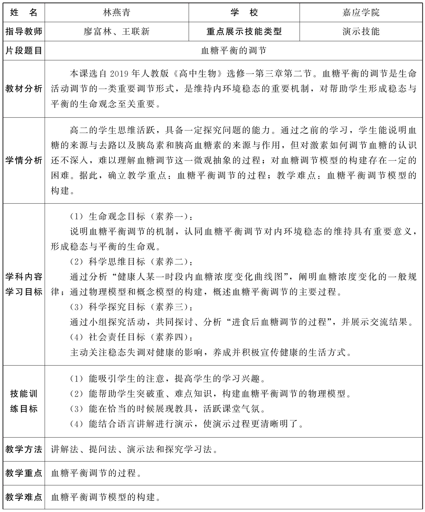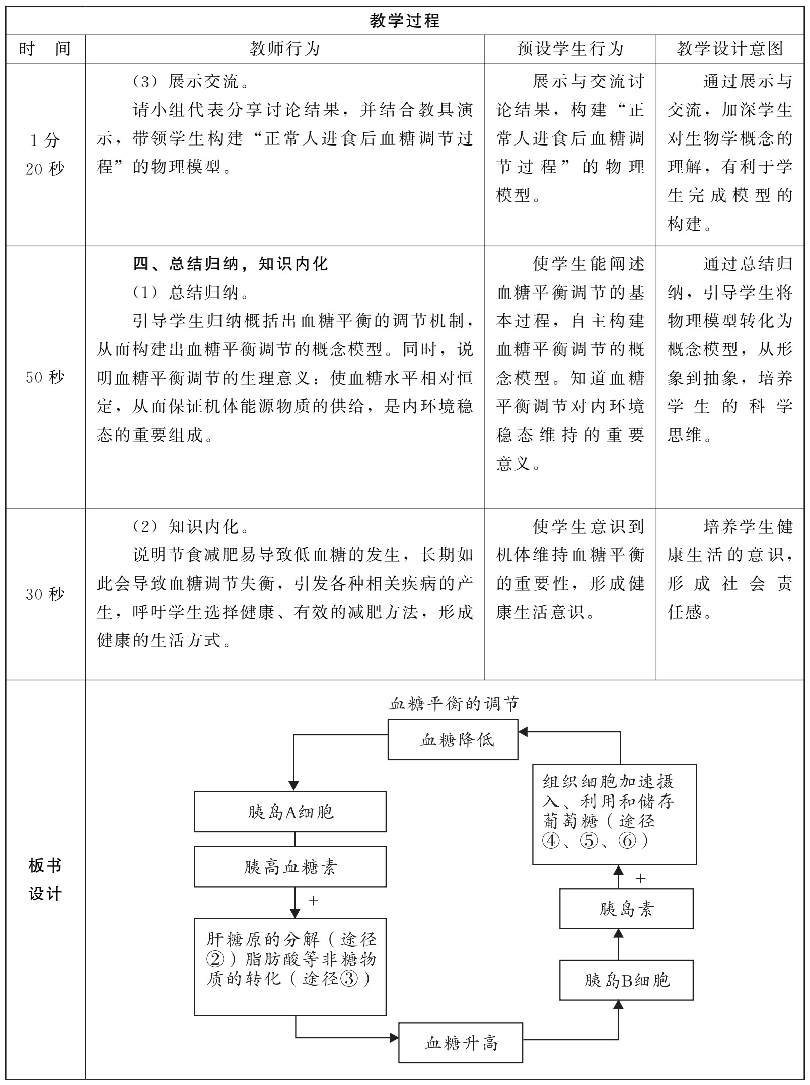 (1)创新性。教学方法具有创新性。通过设置生活真实情境,引导学生开展探究活动,通过图表分析、自制模型演示、合作探究等方式,逐步引导学生构建血糖调节的物理模型和概念模型,发展学生的科学思维和科学探究能力。板书设计图文并茂,较好地突出和突破了教学重难点。