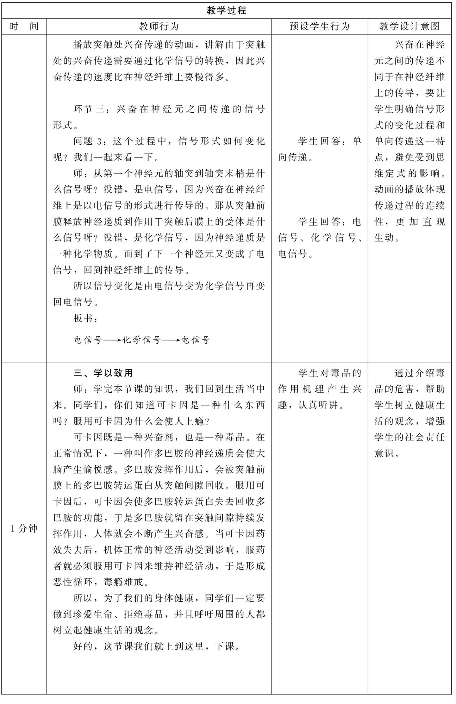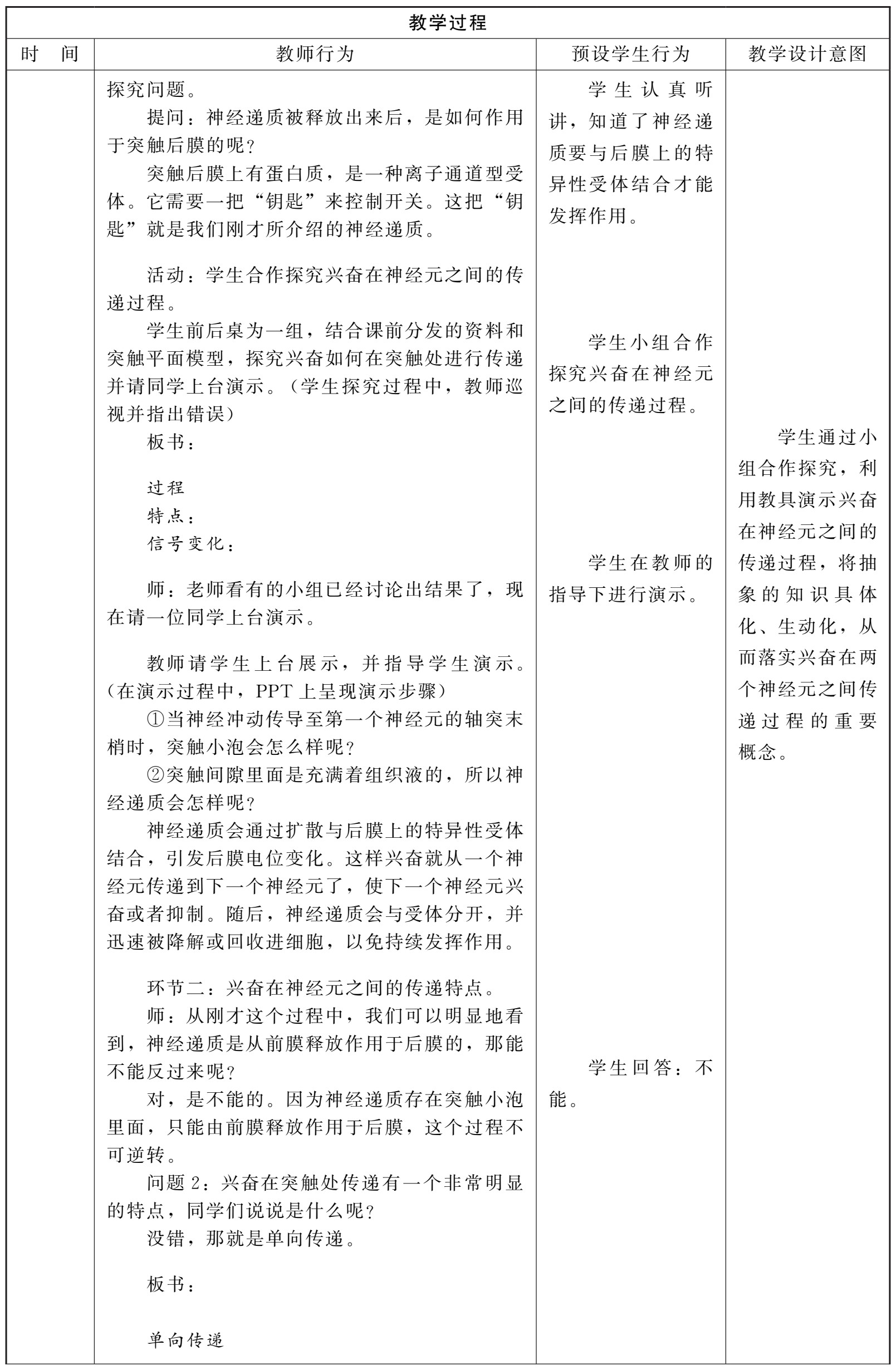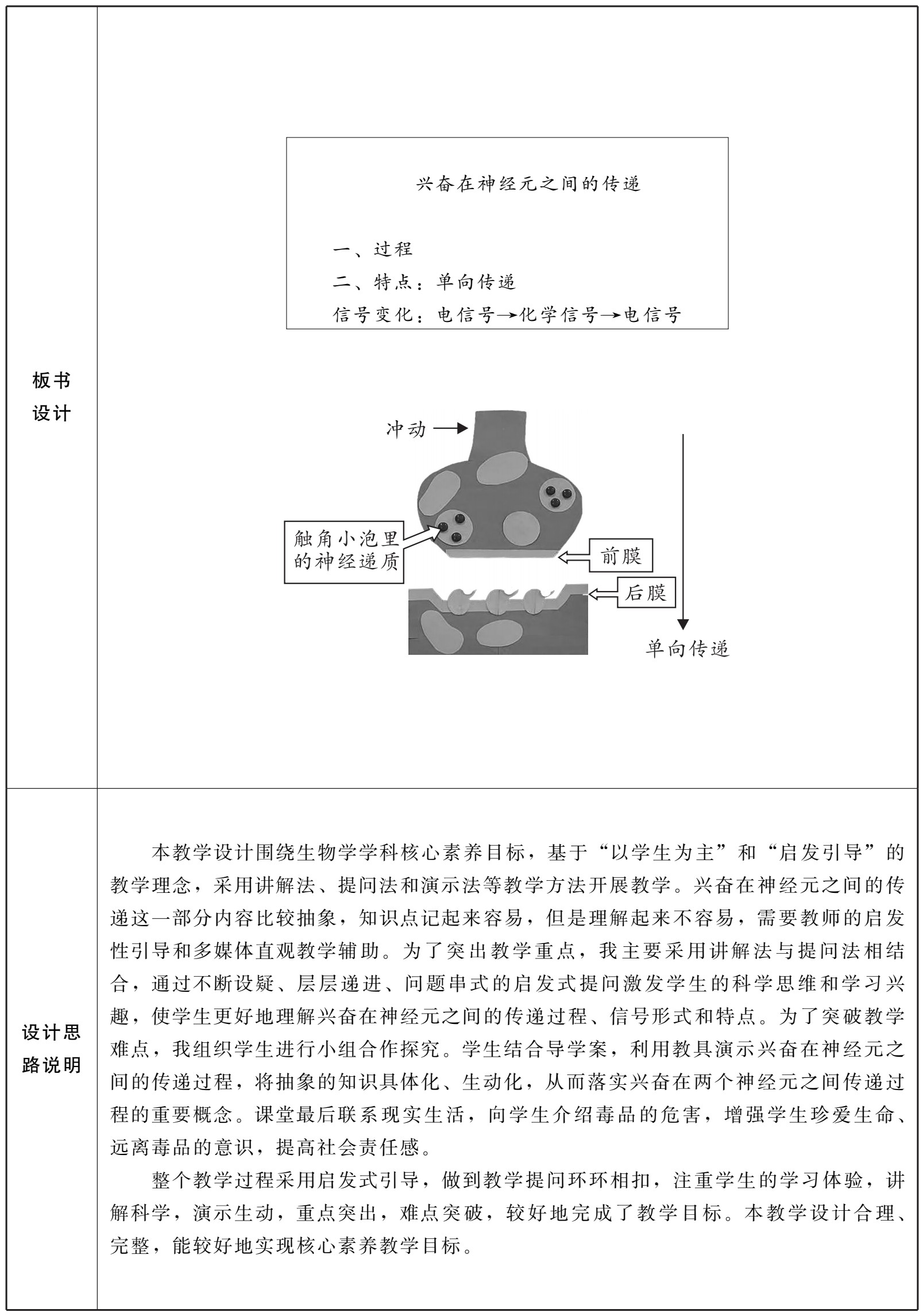 本教学设计围绕生物学学科核心素养目标,以探究式教学为主线,采用讲解法、提问法和演示法等教学方法开展教学。为了突破教学难点,教师组织学生进行小组合作探究。同时,教师采用自制教具和多媒体进行优化组合的教学手段,演示讲解兴奋在神经元之间的传递过程,将抽象的知识具体化、生动化,从而阐明兴奋在两个神经元之间传递过程的重要概念。板书设计图文并茂,新课讲授形象生动。课堂最后联系现实生活,介绍毒品的危害,增强学生珍爱生命、远离毒品的意识,提高社会责任感,较好地落实了社会责任目标。