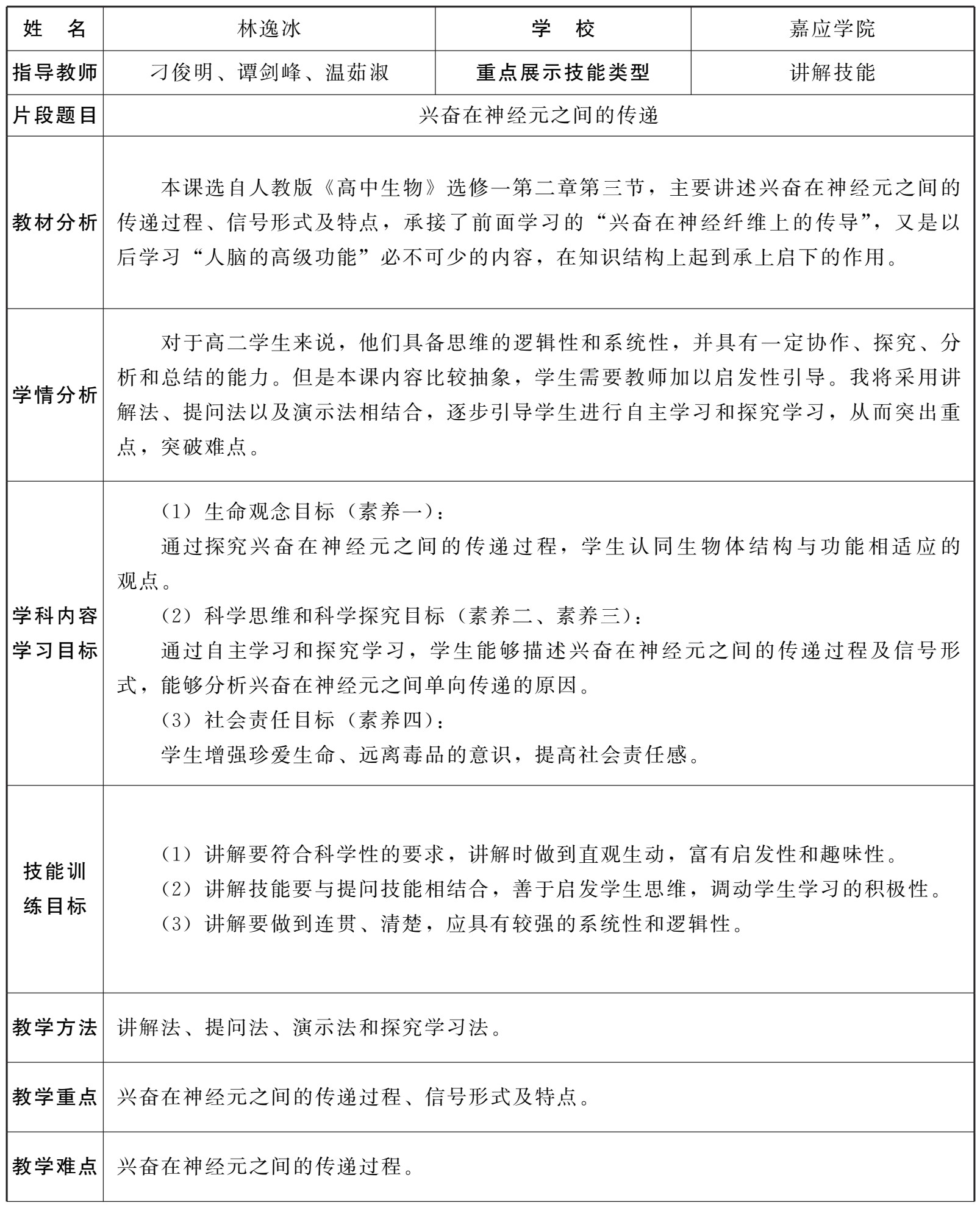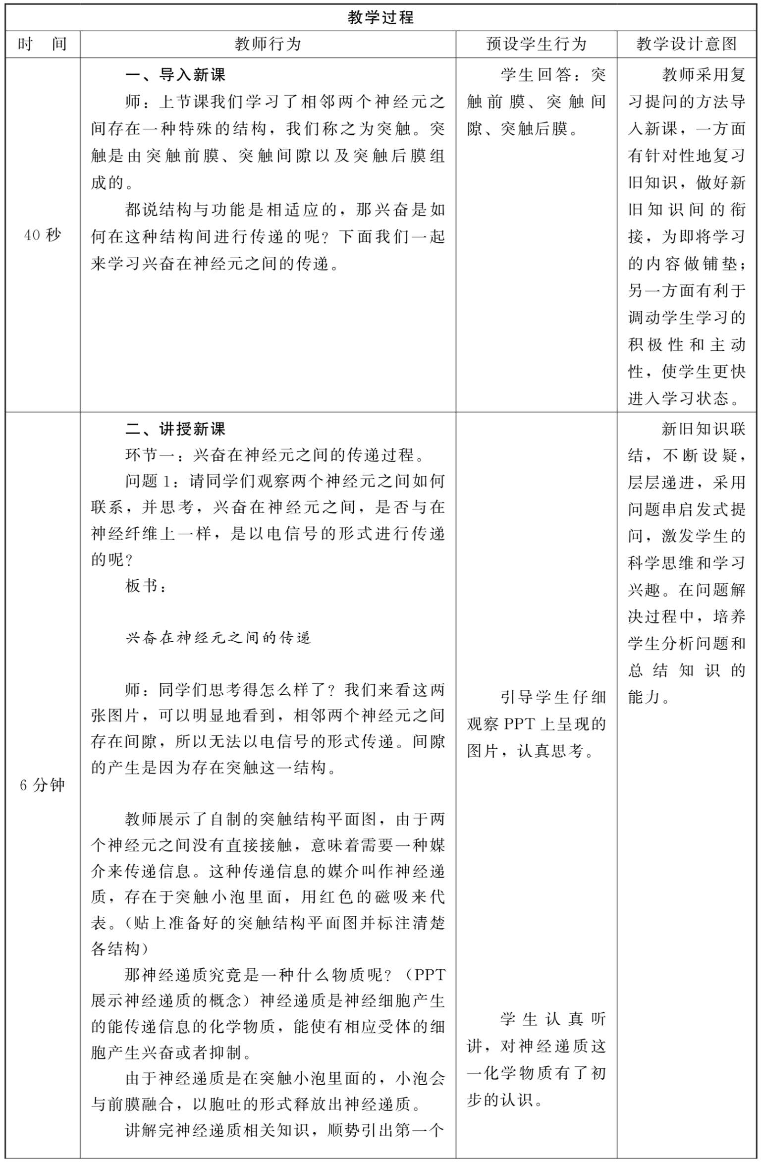 (1)创新性。教学方法具有创新性。教师组织学生进行小组合作探究。教师采用自制教具和多媒体进行优化组合的教学手段,演示讲解兴奋在神经元之间的传递过程,将抽象的知识具体化、生动化。板书设计图文并茂,较好地突出和突破了教学重难点。