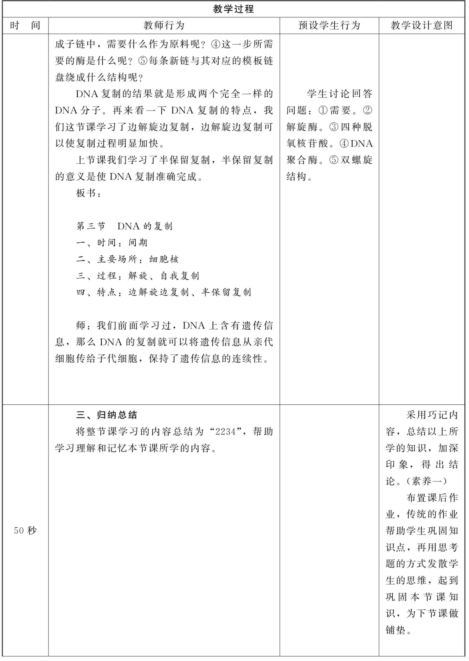 (2)亮点。本教学的最大亮点是:教师首先组织学生小组合作探究,运用DNA平面结构模型教具思考如何进行DNA复制。接着小组代表上台演示完成DNA的复制。最后教师点评学生活动成果,启发引导学生讨论,归纳总结出DNA复制的过程和特点。这体现了以学生为主体的新教育教学理念。还有一个亮点是在课堂的总结环节采用巧记方式,将学习的内容总结为“2234”,帮助学生理解和记忆本节课所学的内容。