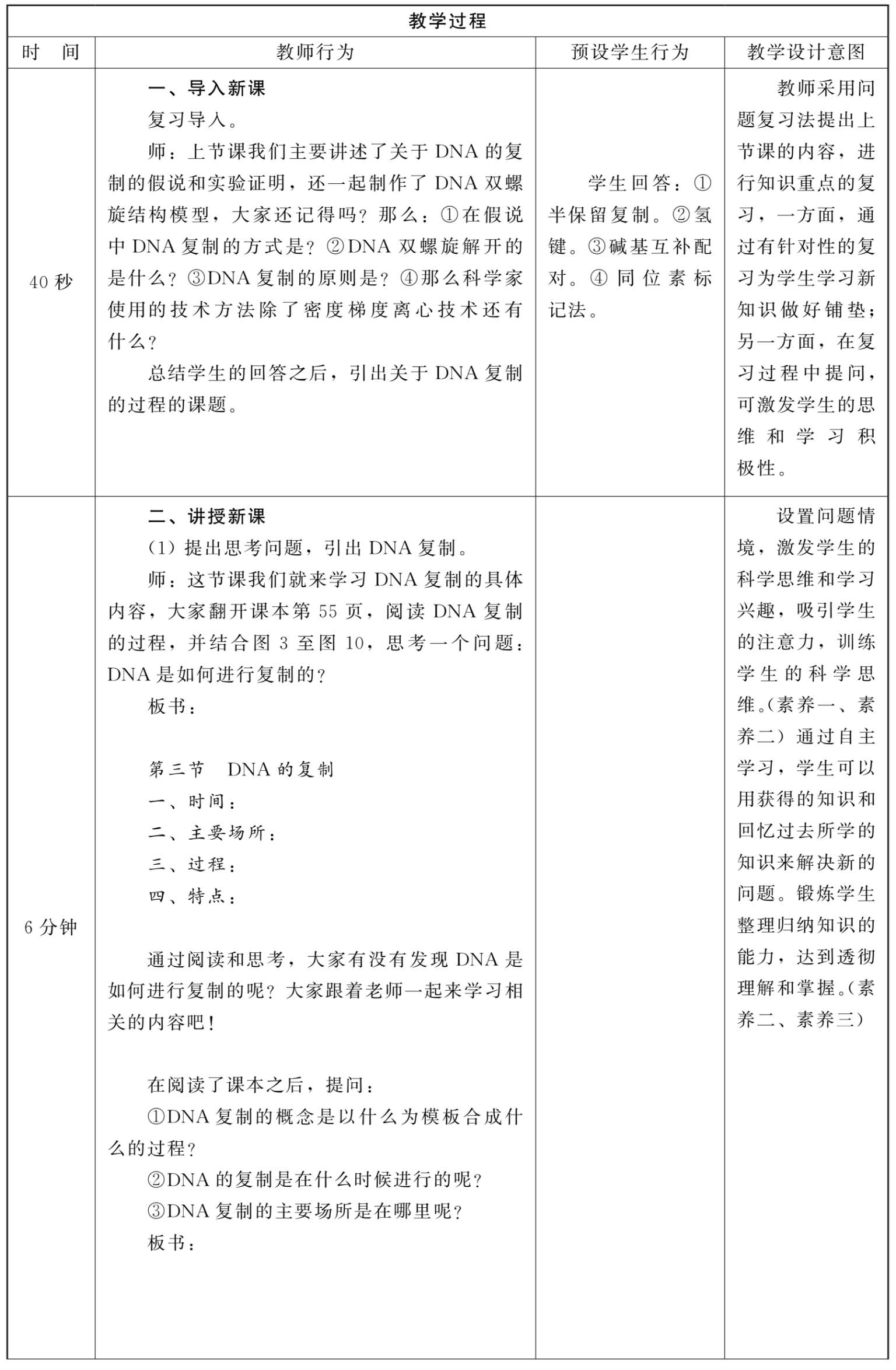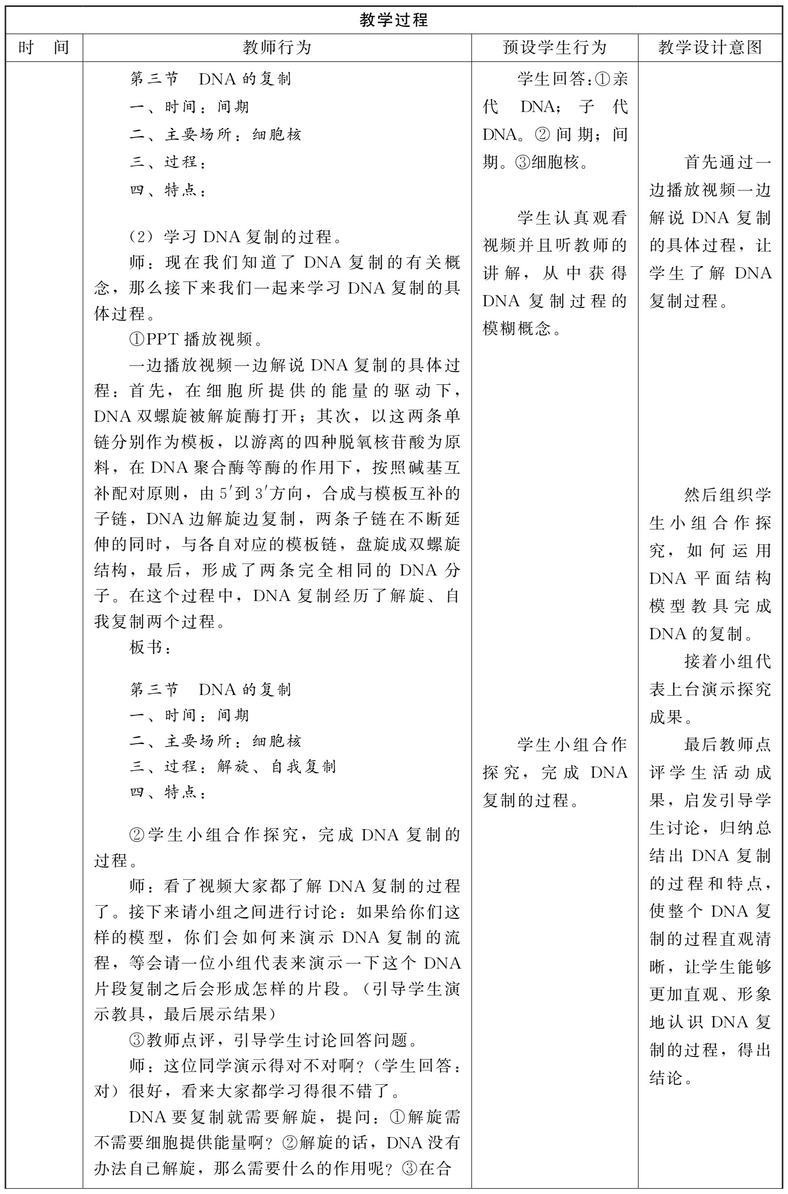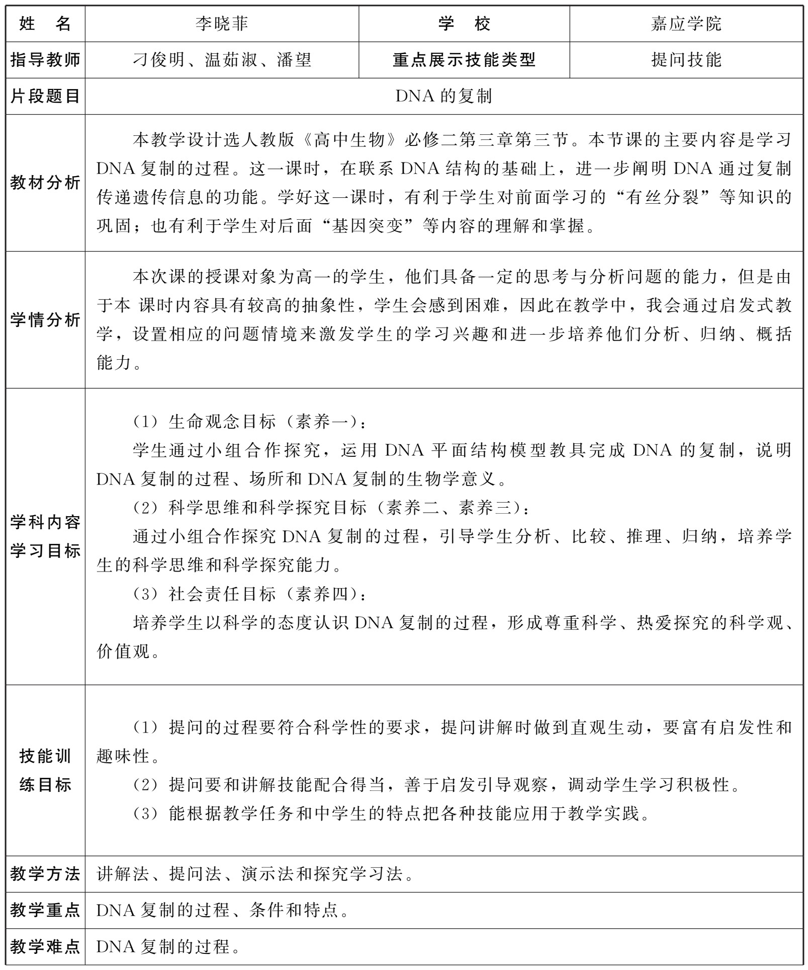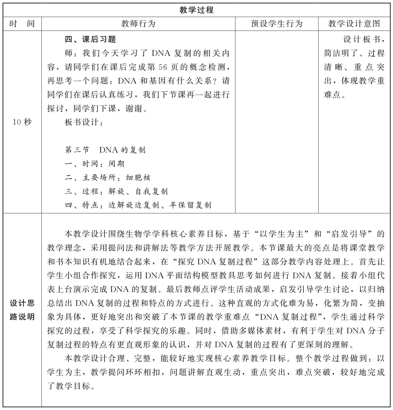 (1)创新性。教学方法具有创新性。以探究式教学为主线,采用提问法和讲解法等教学方法开展教学。教师采用自制教具和多媒体进行优化组合的教学手段,将抽象的DNA分子复制的过程和特点具体化、生动化,较好地突出和突破了教学重难点。