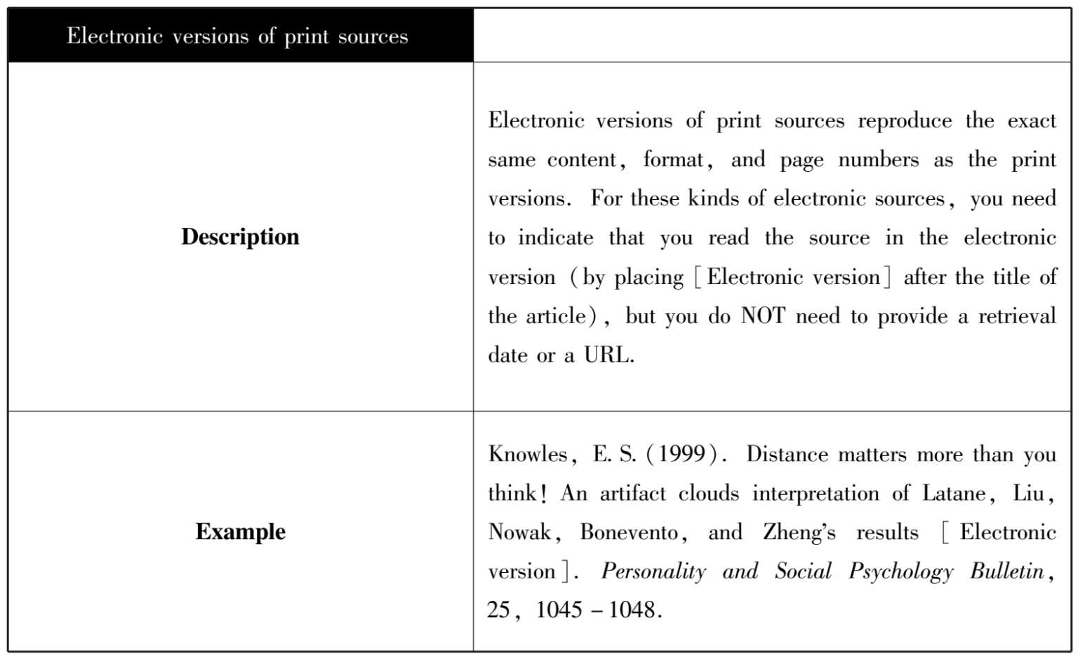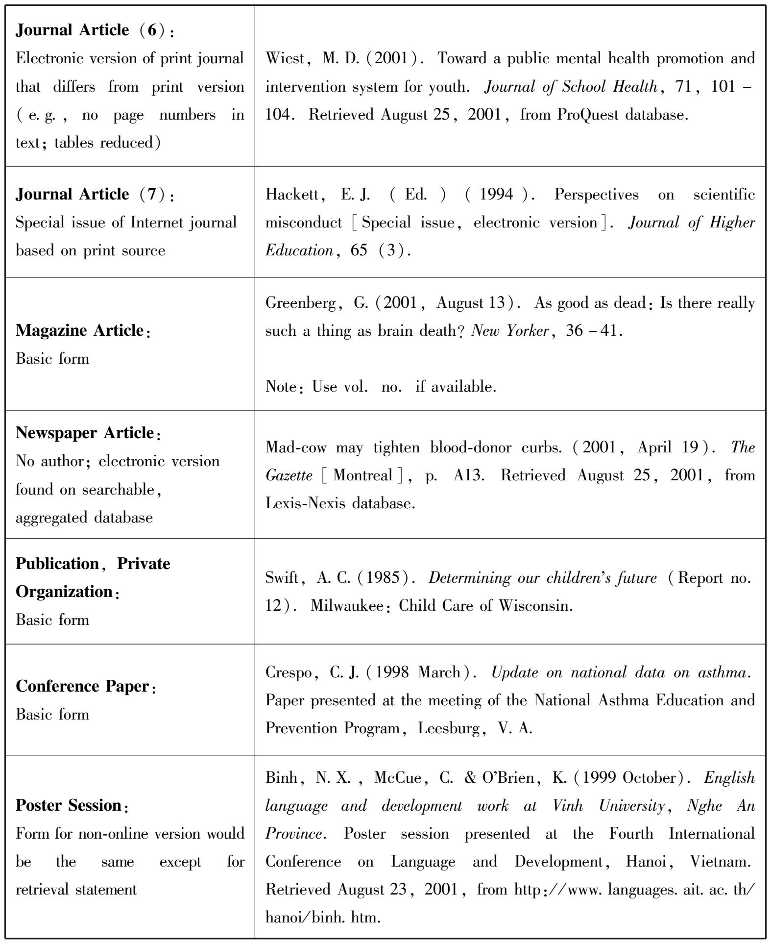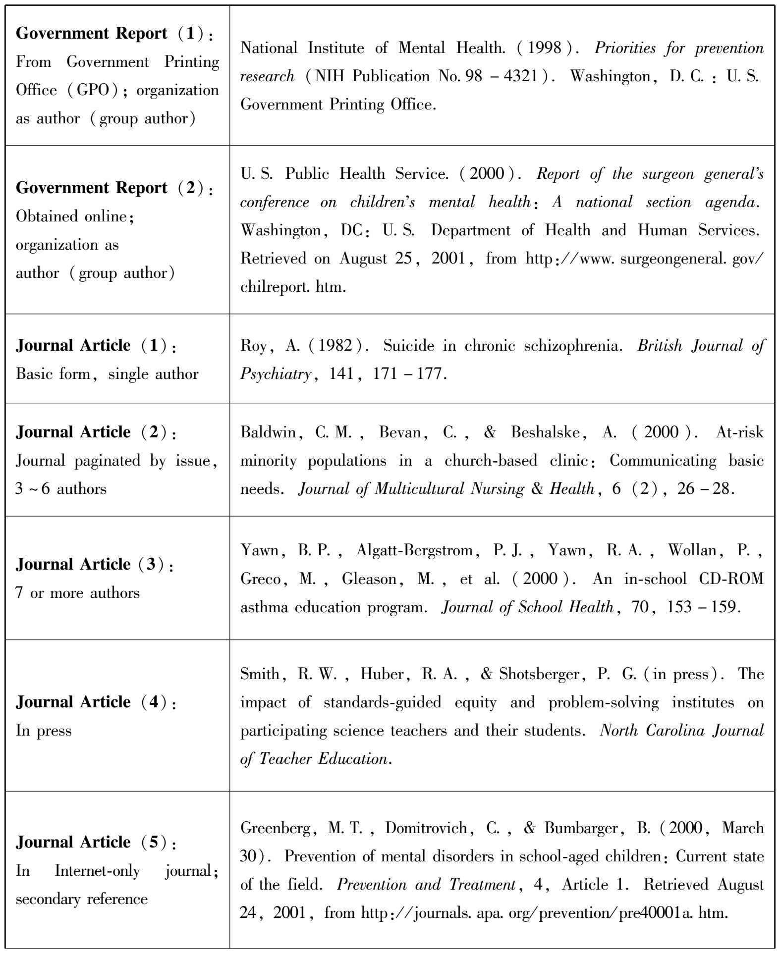 APA格式主要用于心理学、教育学和社会科学领域的论文写作。其规范格式主要包括文内文献引用(Reference Citations in Text)和文后参考文献列举(Reference List)两大部分。APA格式强调出版物的年代(Time of the Publication Year),而不太注重原文作者的姓名,引文时常把出版年代置于作者缩写的名(the Initial of Author's First Name)之前。我国的外语类期刊(以语言学刊物为甚)和自然科学类学术刊物都喜欢使用APA格式。