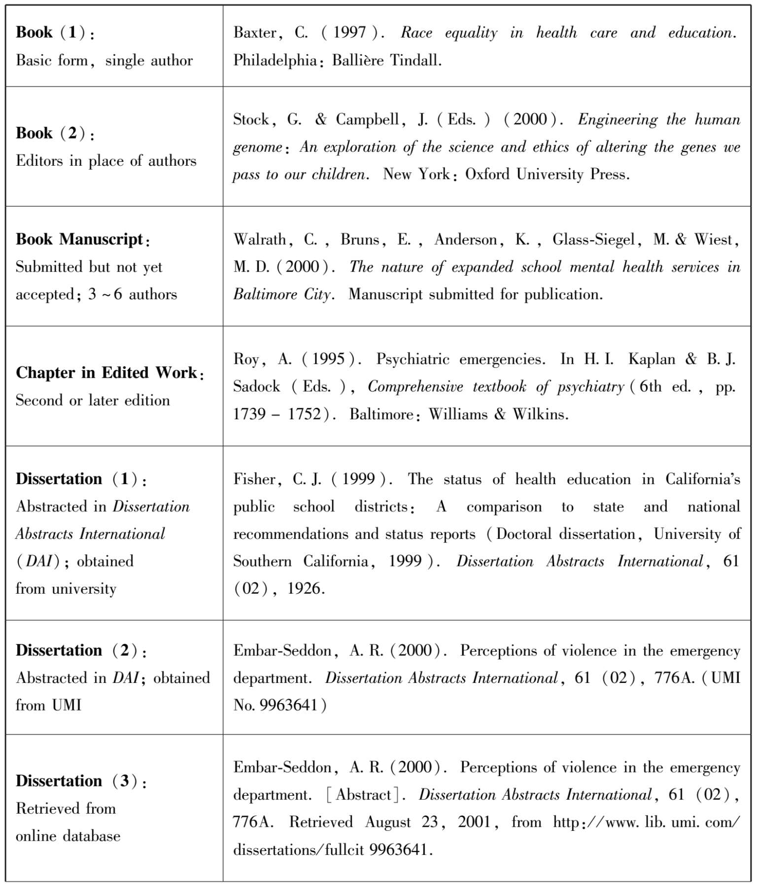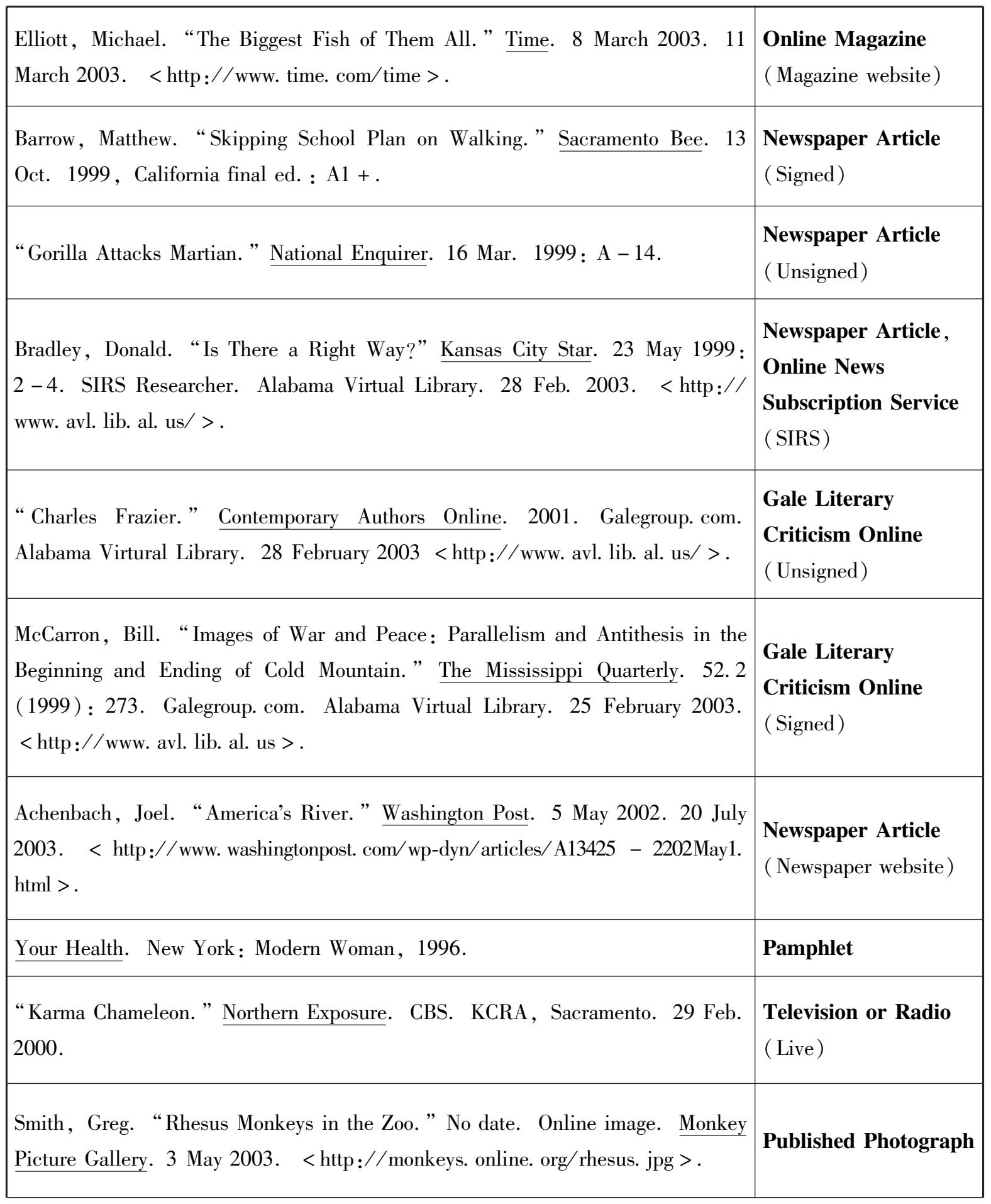 需要特别指出的是,中文书名如果加书名号“《》”表示,书名之后就无须使用表示文献类型的字母。反之,中文书名如果不加书名号“《》”,则需把表示文献类型的字母写在方括号内放在书名之后。一般说来,文献类型字母中的M表示专著,C表示论文集,J表示学术期刊,D表示学位论文,R表示研究报告,N表示报纸文章,A表示从论文集里选用的一篇论文。