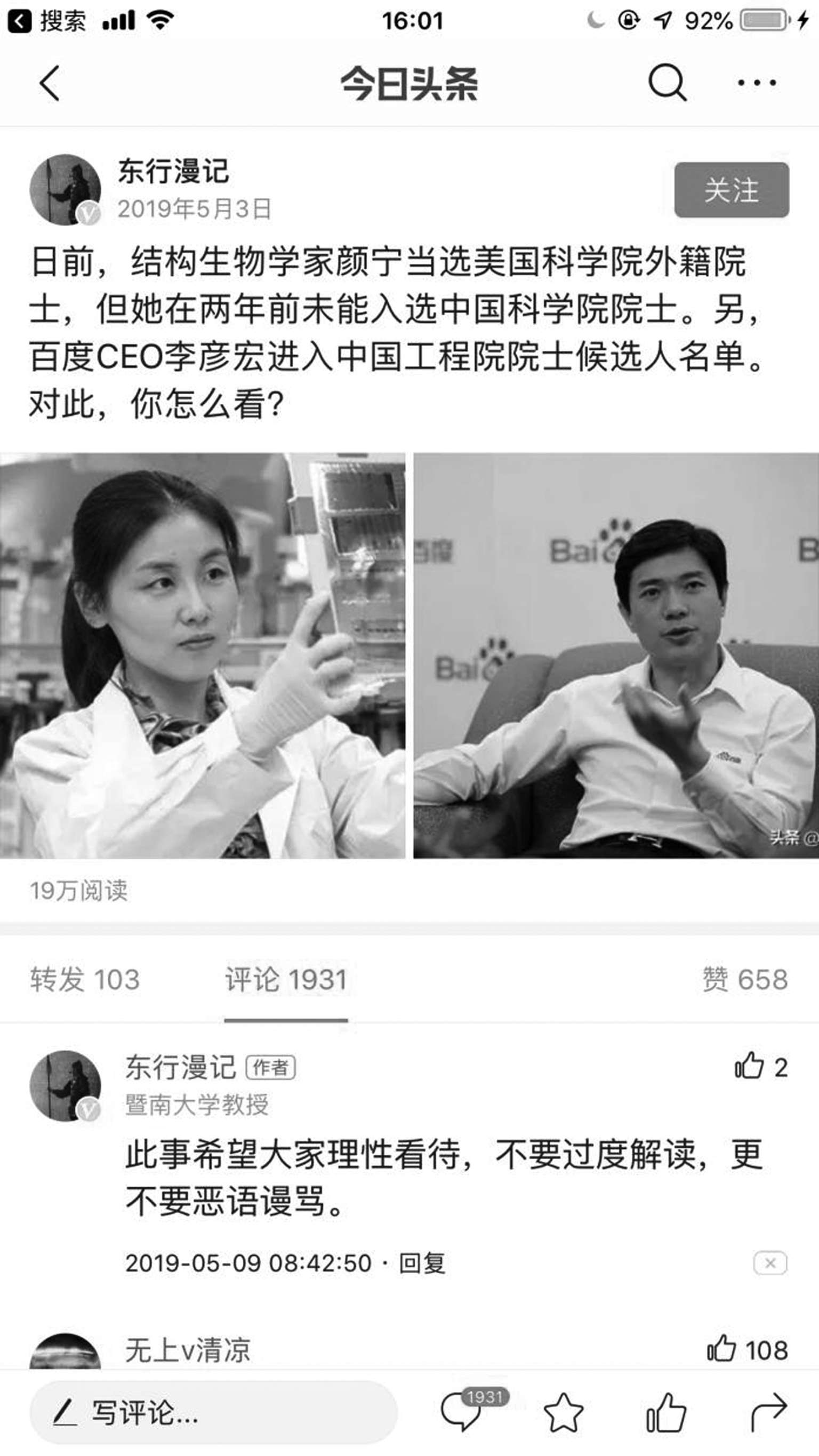 头条号内容有四种体裁:图文、微头条、小视频、问答,其中图文还分文章和图集两种。这些内容产品都有不同的玩法。笔者认为微头条和问答是公众号所没有的重要内容载体。微头条有点像微博,一两句话加几张图片,名言妙语,精彩图片,做得好的话阅读量可轻易超过文章,有的转发加评论的效果也不错。话题性和趣味性很重要。笔者发过一条微头条:“日前,结构生物学家颜宁当选美国科学院外籍院士,但她在两年前未能入选中国科学院院士。另,百度CEO李彦宏进入中国工程院院士候选人名单。对此,你怎么看?”(图2-8)