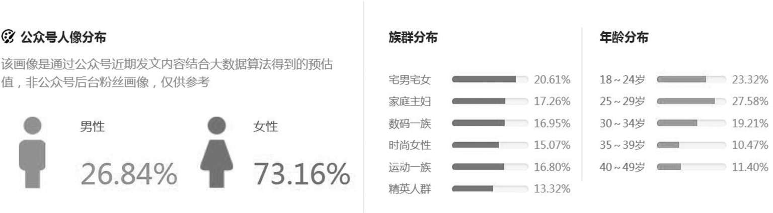 根据西瓜数据对“十点读书”公众号的用户画像诊断(图2-7),发现用户年龄集中在18~29岁,其中女性占70%。而在用户族群分布上,各族群占比差异不大,反映出“十点读书”用户族群的多样性、平衡性。