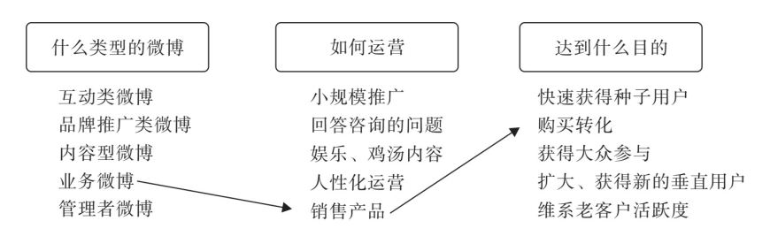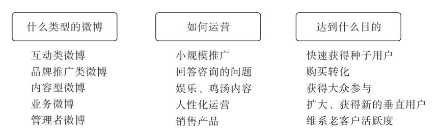 因此,微博号的定位要达到三个标准:①微博风格统一而独特;②明确自己要传递的价值和要实现的目标;③明确自己的受众范围和受众特点。那么,大V们又是如何进行自我定位的呢?首先要明确做什么产品,为谁做,解决什么问题,然后明确做什么类型微博,如何运营,以及达到什么目的。(图2-9)