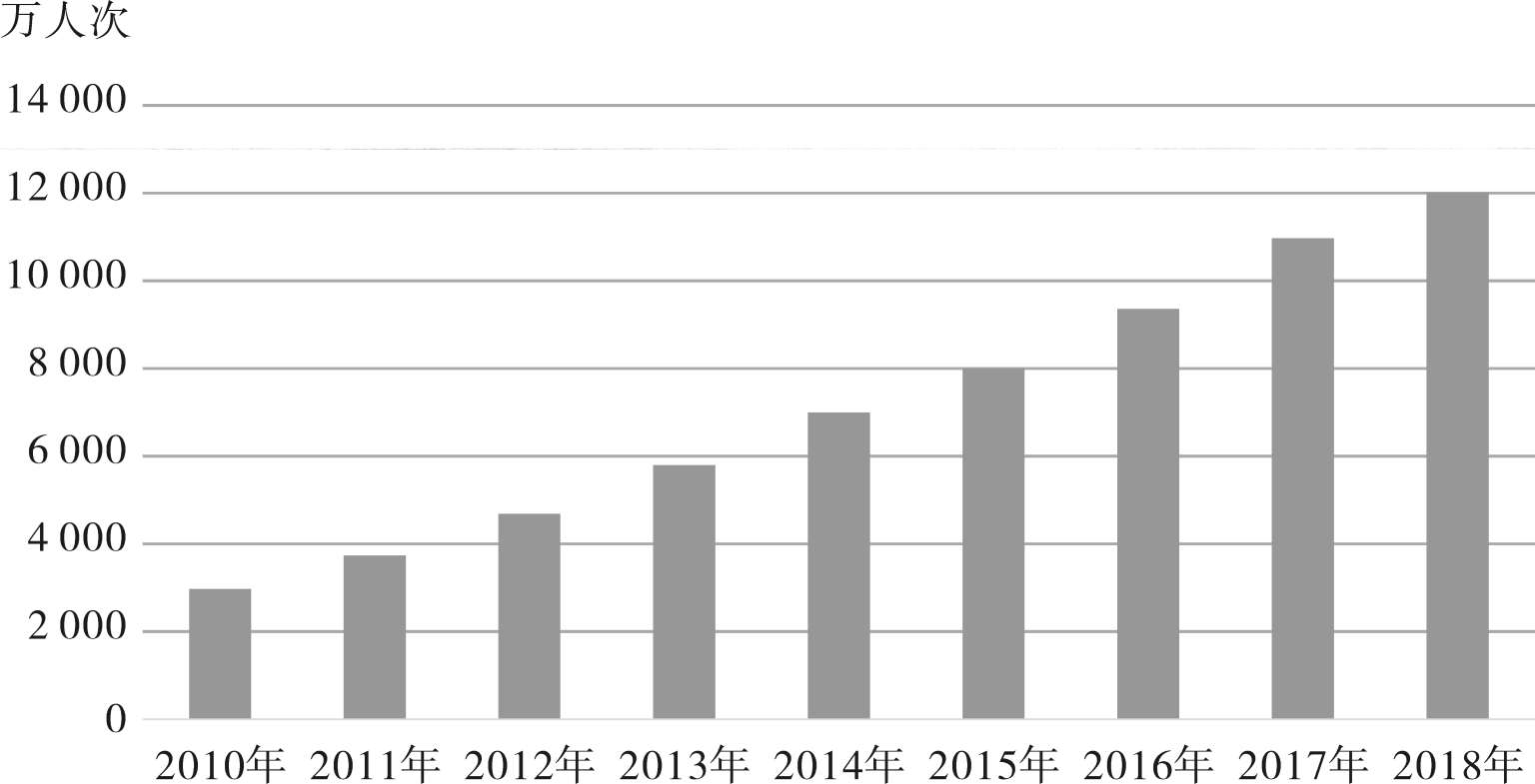 目前,滇西北地区在云南省旅游业占据重要的位置,主要涉及迪庆州、丽江市、怒江州和大理州。这些地州市虽然不完全属于澜沧江流域,却是三江并流的核心区。从数据来看,滇西北旅游发展势头良好。从2010—2018年的9年间,滇西北旅游人数不断增加,从2 971万人次增加至12 007万人次(见图1-1)。从云南全省的旅游数据来看,滇西北的旅游人数占全省的20%~ 25%,紧跟滇中地区,排名第二。