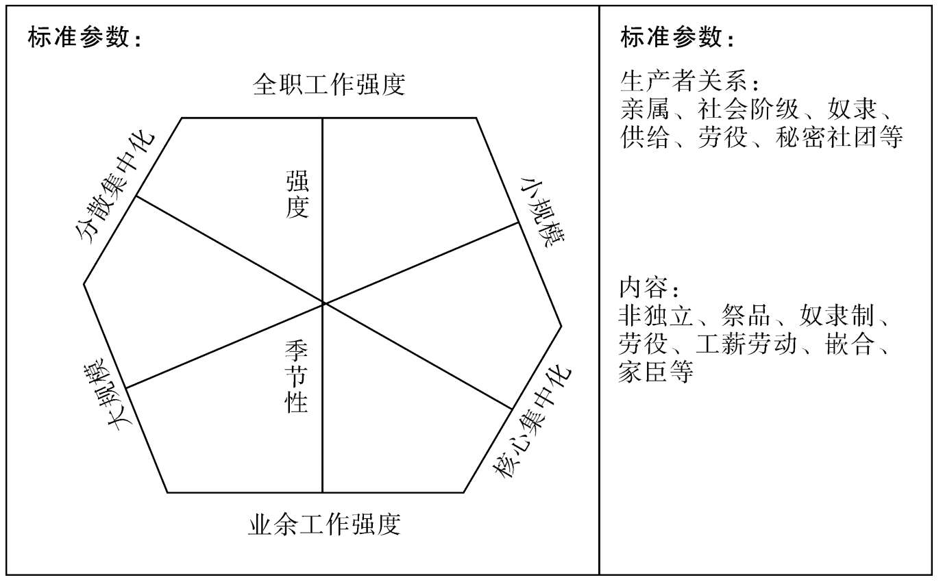 于是,科斯汀对上述观点进行了综合,认为考察专门化生产有四个参数,即生产的背景、集中程度、规模和强度。但是,考虑到社会、经济、政治和环境等变量可能会对参数值产生影响,科斯汀将专业化生产组织进一步分为八类,包括个体专业化、分散作坊、社区专业化、集中作坊、分散劳役、个体官方工匠(retainer)、集中劳役和官方作坊。