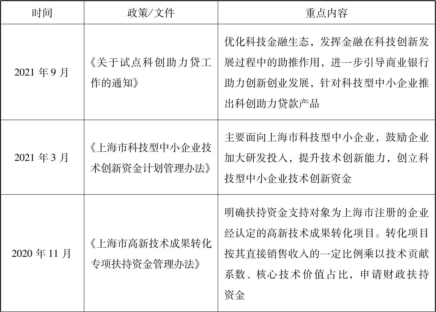 表2-2 近年上海市部分科技金融重点政策汇总