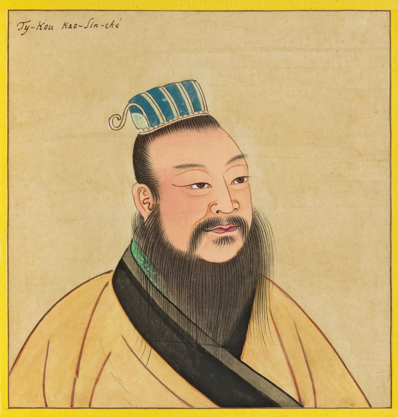 这幅帝喾画像取自一本介绍中国历代著名君主的小册子,其中每一位都配有简短的生平和一幅彩绘插图。这本小册子现存于巴黎的法国国家图书馆,编号为BnF,Chinois 1236。钱德明(Joseph-Marie Amiot,1718—1793)曾提到过,这些图像是1685年勃碣(常岫)从一座名为兴德寺的寺庙中复制过去的,他不仅保留了这些图画的原样,而且还加上了解释。