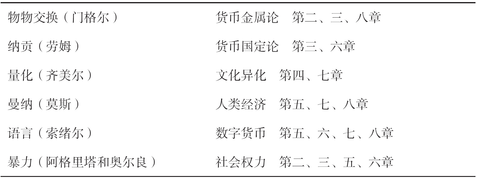 我这里讨论的关于货币起源的论述可以说是当代主要货币理论的鼻祖,我在本书随后的章节将运用这些理论(见表1)。这点有时是显而易见的:在当代货币国定论(chartalism)中——这一理论认为货币实际上由国家创造——看到劳姆对货币与纳贡的论述,不会有人对此感到惊讶。在其他一些情况中,某一当代货币理论与我这里讨论的货币起源迷思之间的关联则不那么明显,也存在争议。例如,在货币作为一种信用和债务形式的理论叙述中,暴力的重要性有多大?在大多数数字货币中,是否隐含着一种语言理论?或者货币作为语言的理念?货币作为一种债务形式,是否一定具有准神圣基础?倘若我们可以在礼物交换中寻得货币的根源,那么这对于另一种观点——货币若要具有价值,必须具有稀缺性——来说意味着什么?对于另类货币世界中的 天才人物 与门格尔提出的货币起源论(在所有起源论中日益被视为是“迷思性”最强的)之间的联系——我认为这种联系几乎是不言而喻的,新潮的比特币用户们会做何感想?但这里描述的所有理论,多多少少都作为迷思运作于今天的货币辩论之中,为我们的讨论提供了历史的共鸣和视角的深度,每当货币的运转让人感到深深困惑,每当“该做些什么?”这个问题似乎最为棘手时,这些理论都是必要的。我用了一个章节来讨论这六种理论,按照以下主题来组织:物物交换、纳贡、量化、曼纳、语言、暴力,因为它们在货币研究中都有着重要地位。一本有关货币的书一定会讨论货币的起源,也一定会援引货币的起源来论证货币今日之性质,抑或来解释未来行动方案的合理性。本书亦遵循这一传统惯例,尤其是指出当下关于货币未来的讨论深深依赖着我们对其遥远过去的假定。