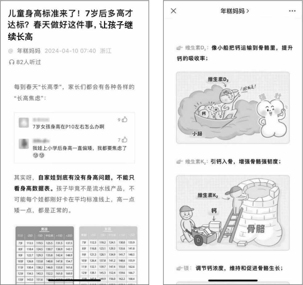 以图文形式展示的产品内容可以让文章表达的主题更加鲜明,突出产品的特点,同时也会提升读者的阅读体验。例如,“年糕妈妈”公众号推送的一篇文案,通过“身高”“标准”“长高”等关键词,配以形象的图片,达到了吸引读者、转化流量的目的,如图1-3所示。