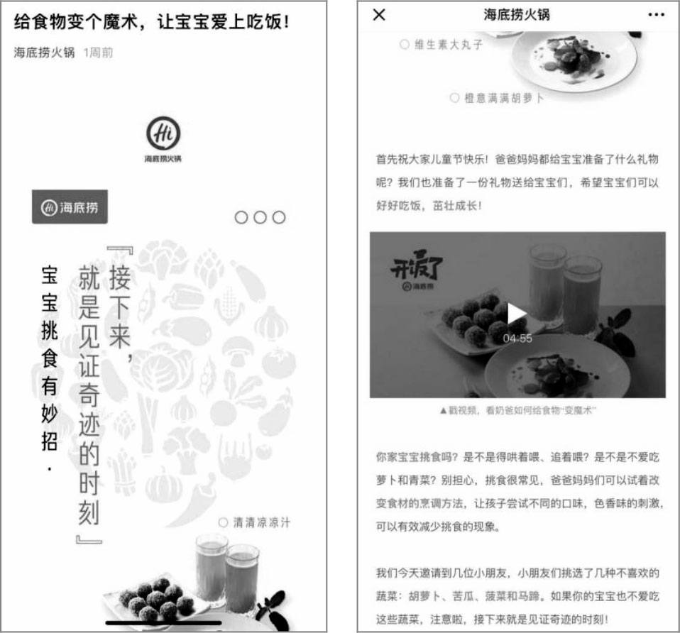 微信公众号的文案多数为深内容,在“海底捞火锅”公众号发布的《给食物变个魔术,让宝宝爱上吃饭!》(见图1-17)中,创作者通过图文结合视频的形式,从爸爸妈妈们都比较关心的宝宝挑食问题,引出如何改变食物的气味、形状、颜色、口感等,像变魔术一样让宝宝爱上吃饭,并配图详细介绍了三种宝宝餐的原料和做法,以教学的形式将内容呈现出来。再如,微信公众号中的“深度好文”“深度美文”也多是深内容,通过某一主题或某一话题展开深度挖掘和剖析,让读者感同身受,从而引起读者共鸣。