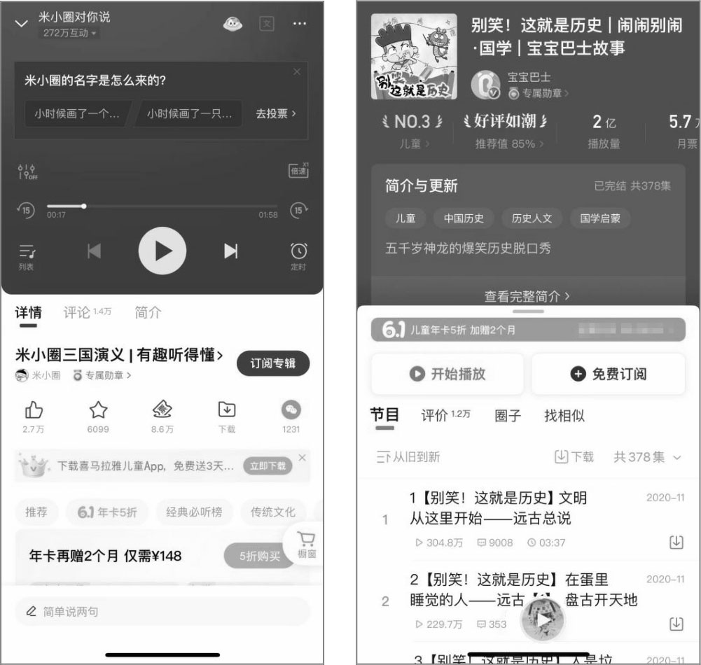 音频内容通常具有一定的深度,在满足用户对内容形式多样化需求的同时,也满足了用户对内容质量的要求。用户在吸收内容的同时解放眼睛和双手,更高效地接收内容。音频内容比较常见的收益方式为知识付费,其代表如喜马拉雅推出的“名家讲学”系列课程。图1-6所示为喜马拉雅App的音频内容展示页面。