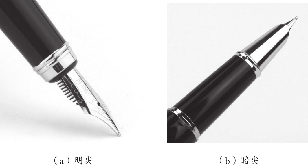 绘画用的钢笔的笔尖要选用明尖,而不要选择暗尖。明尖笔尖有弹性、出墨更快,因此更适合绘画,而暗尖笔尖硬,适合书写,如图1-11所示。