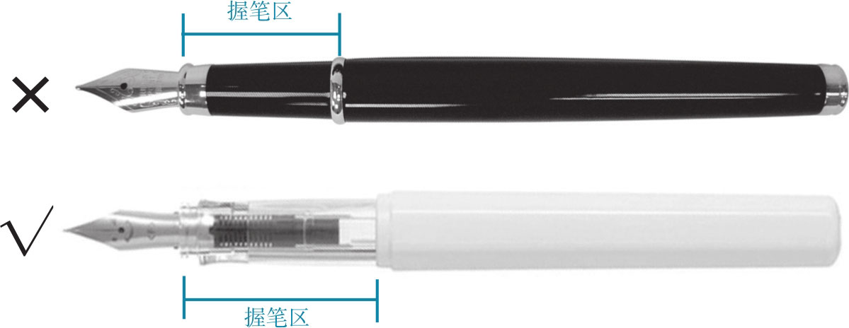 此外,握笔区域的长短也有讲究。绘画用钢笔要选择握笔区域较长的笔杆,如图1-12所示,否则,绘画时容易显得局促。