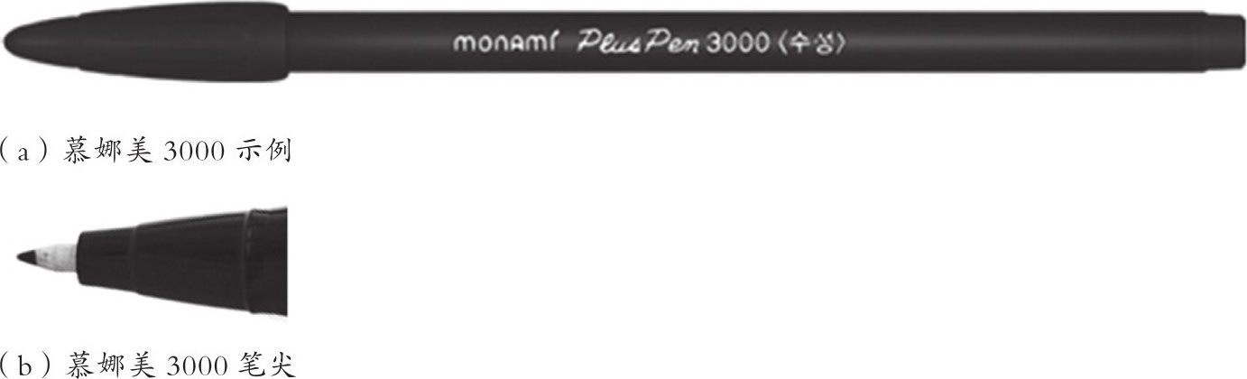 (3)如果不考虑防水性,还有许多笔值得尝试,如“慕娜美3000”,如图1-10所示。这种笔的可选颜色丰富,但没有粗细型号可选;其笔尖触感舒适,绘出的线条优美,能画出少许粗细变化。